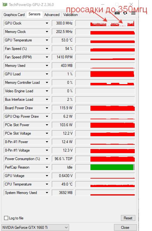 Я сейчас еще Фюрмарк потестил. Видюха реально не нагревается до ее рабочих температур. 70 градусов должно быть в среднем. Плюс идут жесткие просадки вообще до 315 мгц, я даже скрин сделал у Фюрмарка с этой просадкой и эти же просадки видны на скринах от gpu-z. В общем я наверное пойду, попробую винду переустановить, если и это не поможет, тогда буду искать блок питания другой.