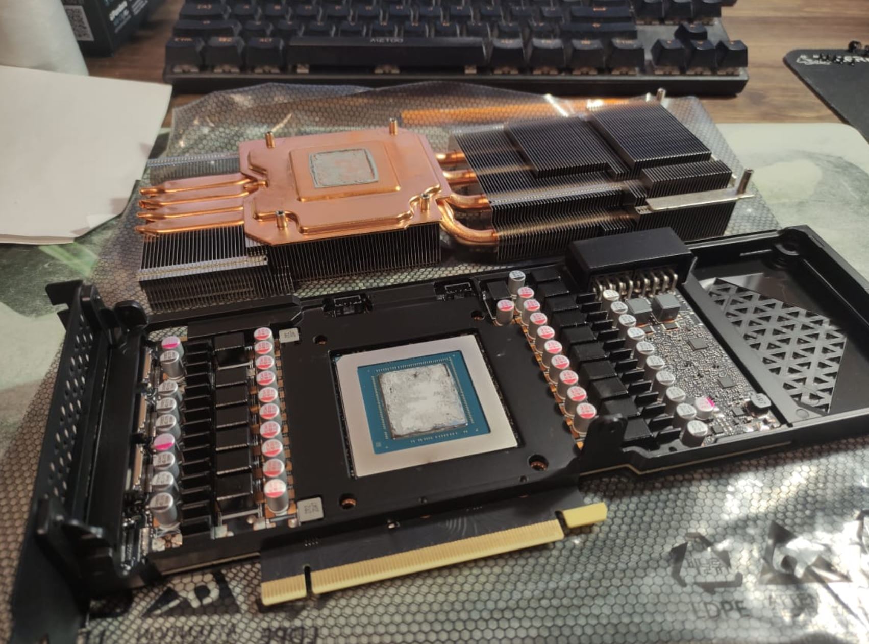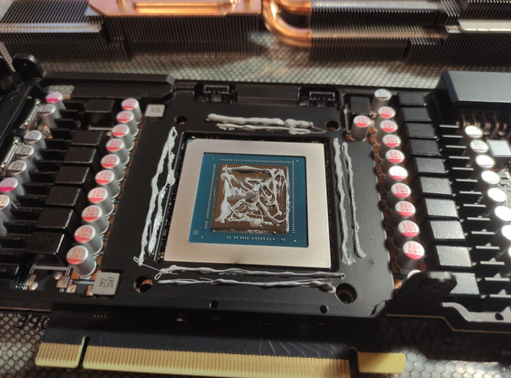 вот что бывает с тем местом где прокладки висят как тряпочка. Замена термоинтерфейса у МСИ является причиной отказа по гарантии. Так что мб если майнить не собирается оставить как есть если помрет вернуть по гарантии.. А вы уже сняли прокладки и сток пасту. Ну тогда пасту под пластину, там где висит прокладки под трубки подложить, медную пластину смысла делать нет т.к со стороны бекплейта все равно память будет горячее. И там где висит как тряпочка что то допилить и молиться что бы она не померла т.к вы самолишились гарантии))