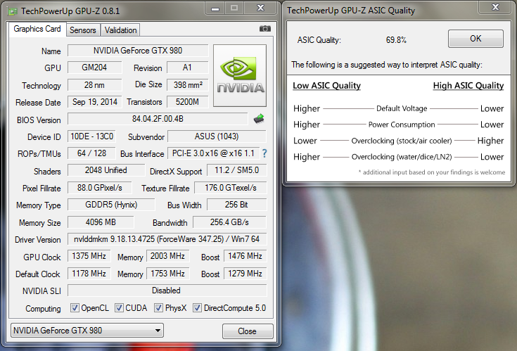 Поменял Gigabyte GTX 970 на ASUS STRIX GTX 980 OC (предложили новую за 500$ - не смог удержаться). ASIC 69.8% Память Hynix 1500/8000 взяла без проблем на родном биосе и дефолтном напряжении 1.212V Если интересно могу выложить тесты.