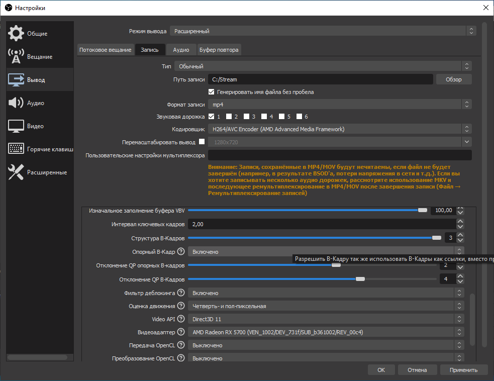 Во-первых, кодировщик изменился до версии 3.0 (у нави VCN 2.0). Проверить это меня заставило обновление программного кодировщика AMF (обновился до версии 1.4.18) в новых драйверах для радеонов 6000. А также у меня в OBS появились эти опции, но сам плагин глючит (не выставляет битрейт больше 1kbps, а на других пресетах B-кадров нет). На то, что серия 5000 стала поддерживать B-кадры я не рассчитываю, хотя и не исключаю, что такое стало возможно.