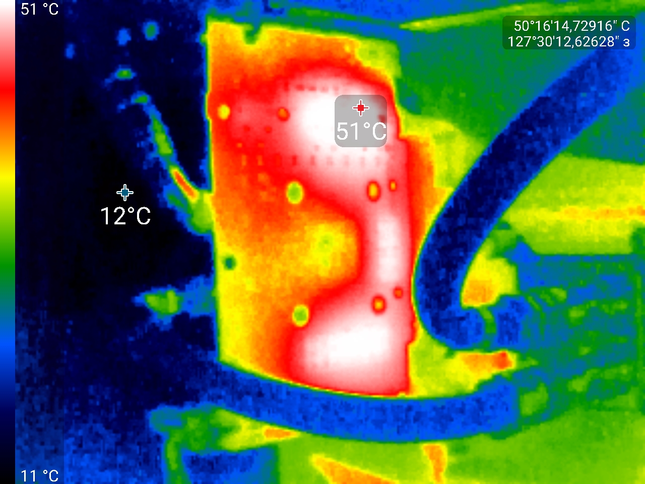 Добавлю пару фоток. Комп чуть продуло, но на лоджии тёплый пол. VRM и память не стал фотки делать с тепловизора - жутко не удобно снимать (очень коряво нафотал), но вышло не больше 56 градусов.