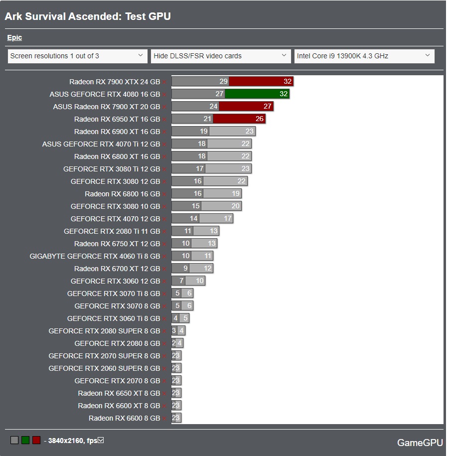 Привет басням, что 3060 перспективнее 4060ti благодаря 12Гб памяти против 8 и полноценной шине. Особенно забавно смотрится именно минимальный ФПС. Даже 6700Xt медленнее хотя вообще карты от АМД показали себя хорошо. Хотя в целом ФПС конечно совершенно неиграбильный и нужно снижать качество графики.