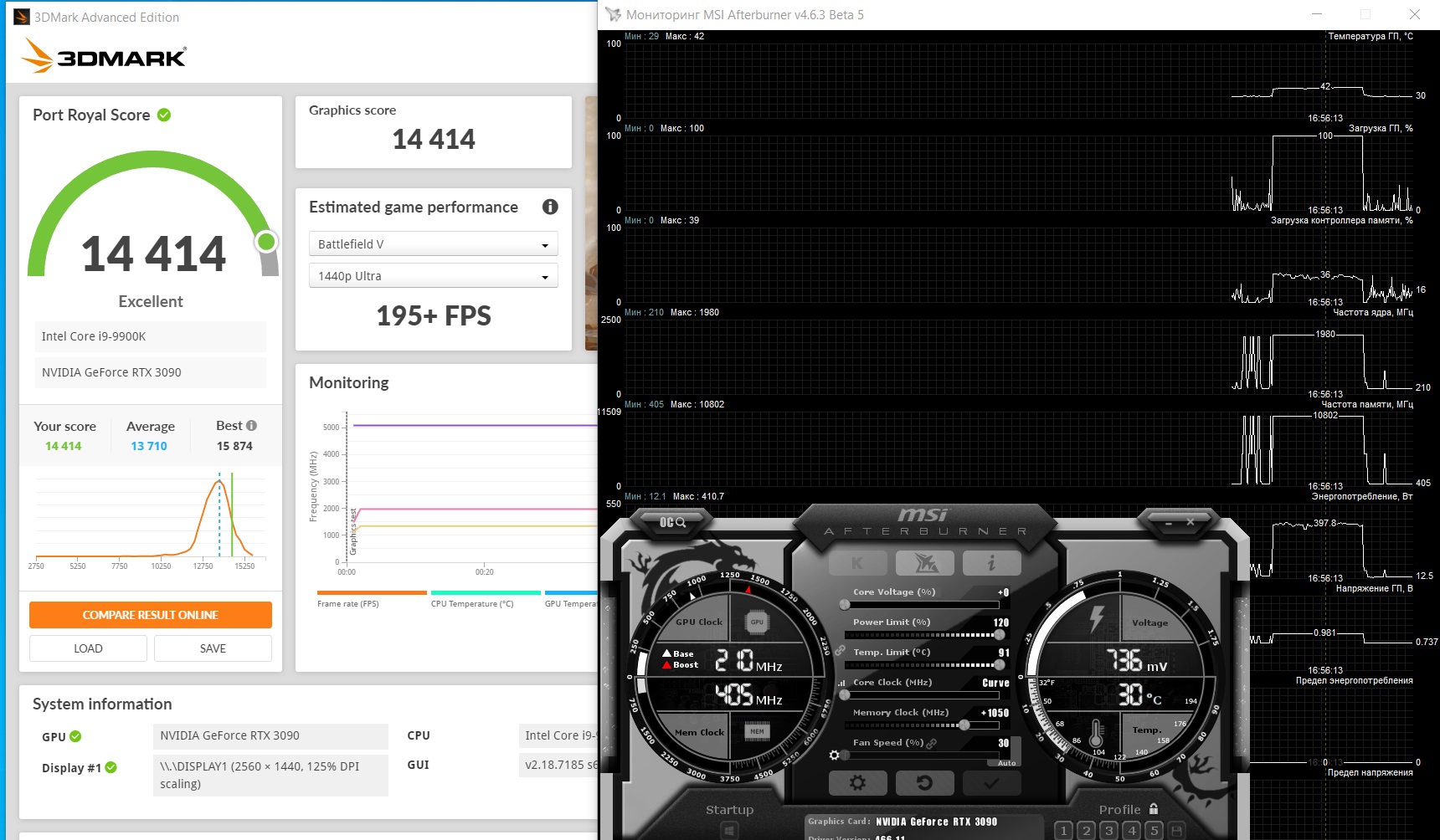 Я выше выкладывал скрин с 14400 в рояле, чип 1980, пиковое потребление в тесте 410 ватт. Эта частота должна быть достижима всем 3080TI. Так что лимитов на это результат у тишек должно хватить за вычетом отсутствующих 12гб жрущей памяти. Пока мало карт в ветке, посмотрим.