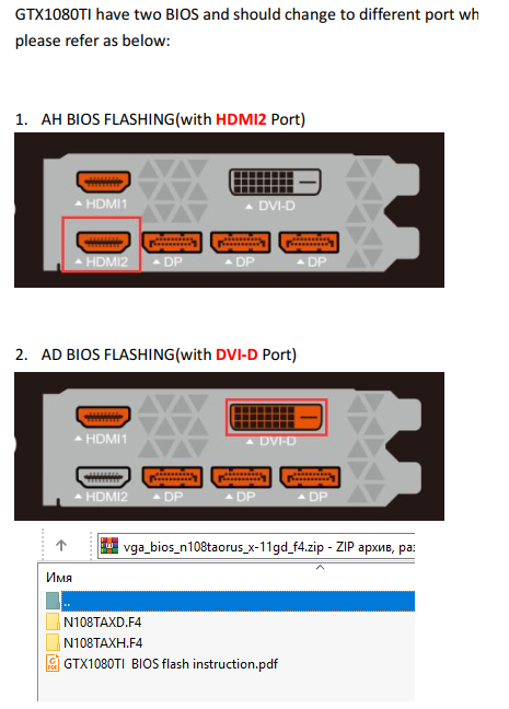2. И кстати скачивал я ранее как раз отсюда Биос F3P https://www.gigabyte.com/ru/Graphics-Card/GV-N108TAORUS-X-11GD#support-dl-bios Но вот при попытке запустить файл N108TAXH.F3P.exe, который лежит в корневом каталоге "N108TAXH.F3P" у меня появляется окно с ошибкой: "Please close Aorus Engine before updating the BIOS" а затем после нажатие OK появляется такое же окно с ошибкой, но с текстом: "This BIOS version does not match" Я прекрасно понимаю что написано и в первом и во втором случае. Тот же Aorus Engine я даже не включал, а потом и вовсе его удалил, но и это не помогло. Речь ведь о фирменной утилите? Что я делаю не так? Или чего я не делаю? Попробовал там же зайти в папку "x64" и там уже запустить файл N108TAXH.F3P.exе, как будто всё получилось (всё происходило в окне cmd.exe)