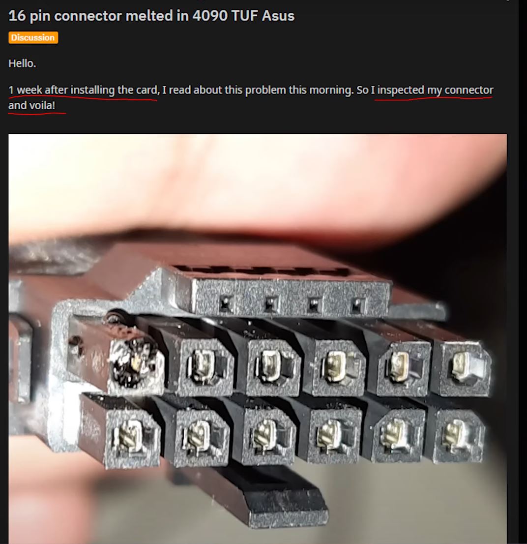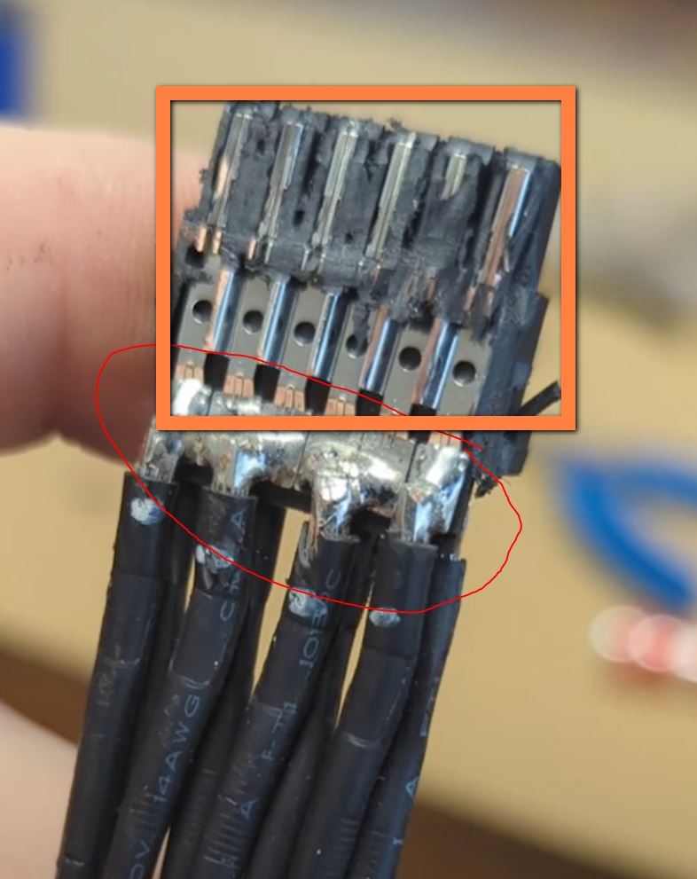Ещё озвучивались варианты криворукости сборщиков и я готов подтвердить, что такое может быть на своём примере. Мы установив 4090, включили комп, он нормально так работал, но через несколько минут, один из кабелей внутри корпуса, стал задевать вентилятор системника, я полез устранить это дело, после завершения, изображения на компе не было. Там дальше перегрузки компьютера были бестолковые, но оказалось дело в этом 12 пиновом переходнике, когда его подергали, он легко вывалился из гнезда карты. Получается на ряду с качеством переходника, названная криворукость способствует вот этим прогарам. Все описанные действия произошли наверное в течении 10-15 минут, что видимо и помогло избежать последствий.