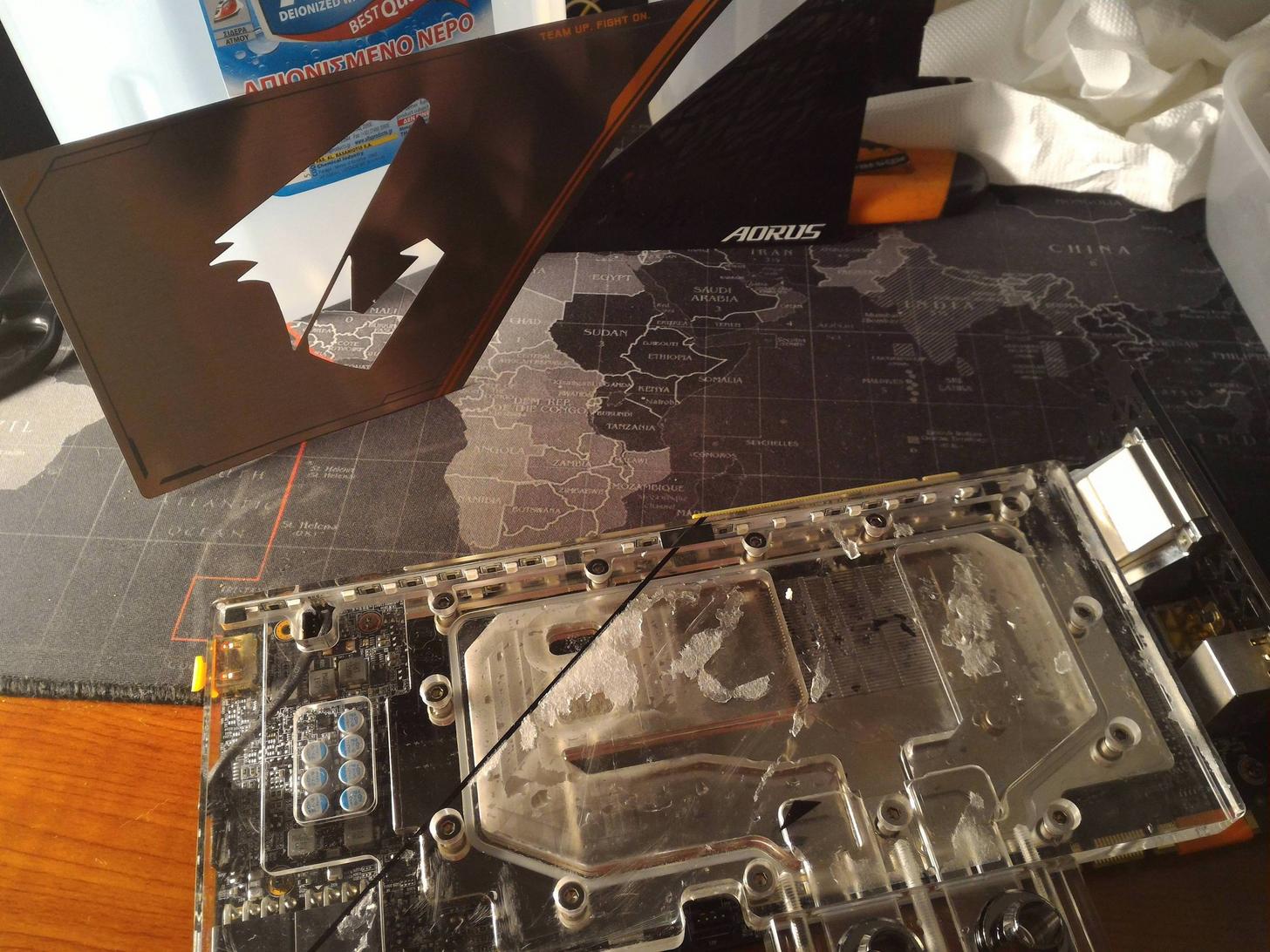 1) на самих деталях, к которым прилегают прокладки, были влажные следы. Причем довольно сильные, я сперва испугался и подумал это блок течет. Я так понимаю это силикон? 2) с терпопастой на ГПУ была жопа полная, простите. Залито нахер все и паста, которая стекла с ГПУ высохла напрочь. Аккуратно отковыривал. Поэтому наверно не зря разбирал. 3) мусор в блоке есть и его хрен разберешь без отдирания алюминиевой наклейки. Гигабайту кол в одно место за такой подход и дизайн. Жаль я это узнал после покупки. Возможно, воздержался бы.