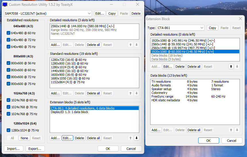 Я видел системы с включённым FreeSync на Nvidia где попытки удалить что либо из блока стандартных разрешений и снятие галочек вешали намертво систему. Не чёрный экран а именно мёртво, даже намлок не отключить. Причём с выключенным можно тоже всё начисто стирать. Там очень нежно можно манипулировать параметрами, обязательно с проверкой перезагрузкой. Иначе придётся потом из безопасного режима в CRU сбрасывать или просто целиком удалять EDID из реестра. Какое же всё кривое в плане связки видеокарта - монитор.