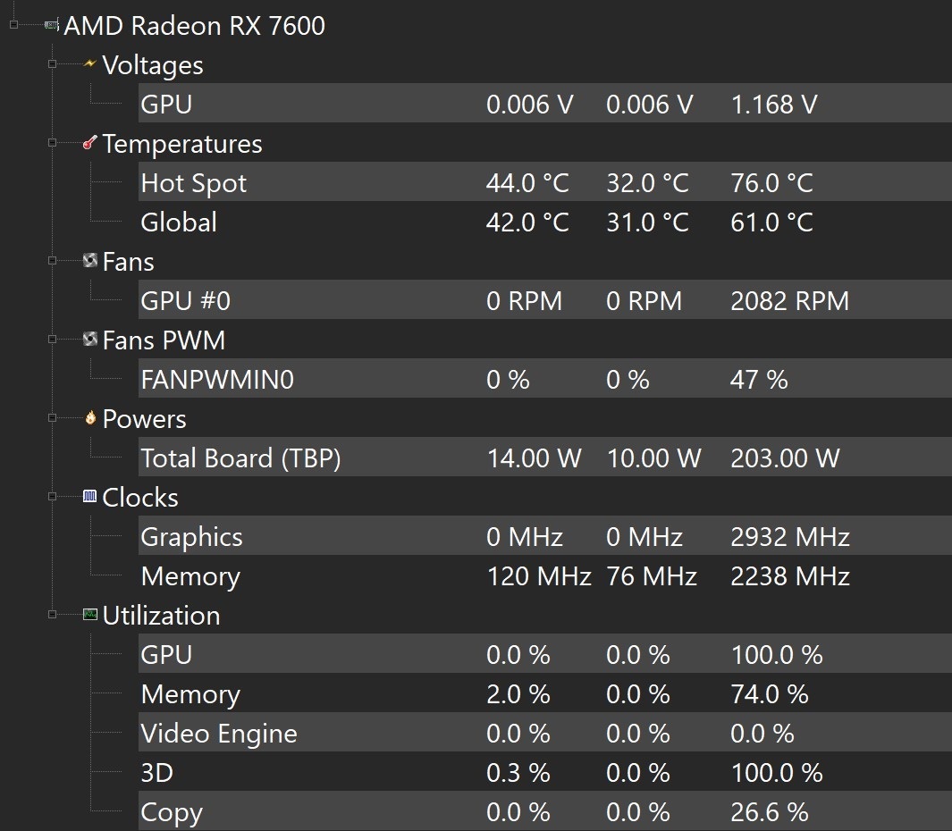 А как ты делаешь вывод об уровне шума? По числу оборотов? Так это не правильно. Старая карта на 2000rpm орала как пылесос, значительно перекрикивая вентиляторы корпуса. Новая карта при тех же 2000rpm не шумнее корусных вентиляторов (два по 1200prm и два по 1500rpm). А при заводских 1500rpm карту вообще не слышно за корпусными вентиляторами. Поэтому смело можно поднимать. На моей AsRock полированые вентиляторы на двойном подшипнике, они значительно тише обычных вентиляторов и шикарно охлаждают. Карта холодная, хотя частоты высоченные. Если андервольт сделать температуры и обороты упадут, но зачем и так всё отлично.