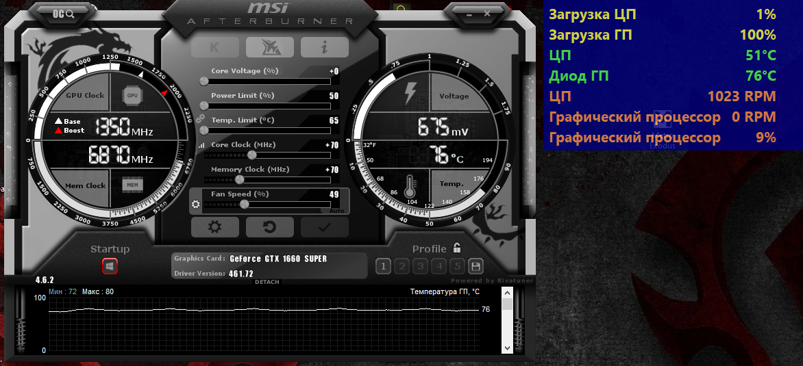 Не могу выставить охлаждение на GIGABYTE GeForce GTX 1660 SUPER Gaming OC [GV-N166SGAMING OC-6GD]. Меняю MSI afterburner, кулер сначала разгоняется, а потом начинает медленно тухнуть опускаясь до постоянного значения в 44-46%. При нагрузке 100% на видеокарту всегда висит 80 градусов при работе кулера 44-46%. На постоянно увеличить его скорость у меня не получается. Отпустил PowerLimit на 50% все равно греется до 75-80 только теперь вентилятор совсем встаёт. В NI бегунок кулера вообще заблокирован.