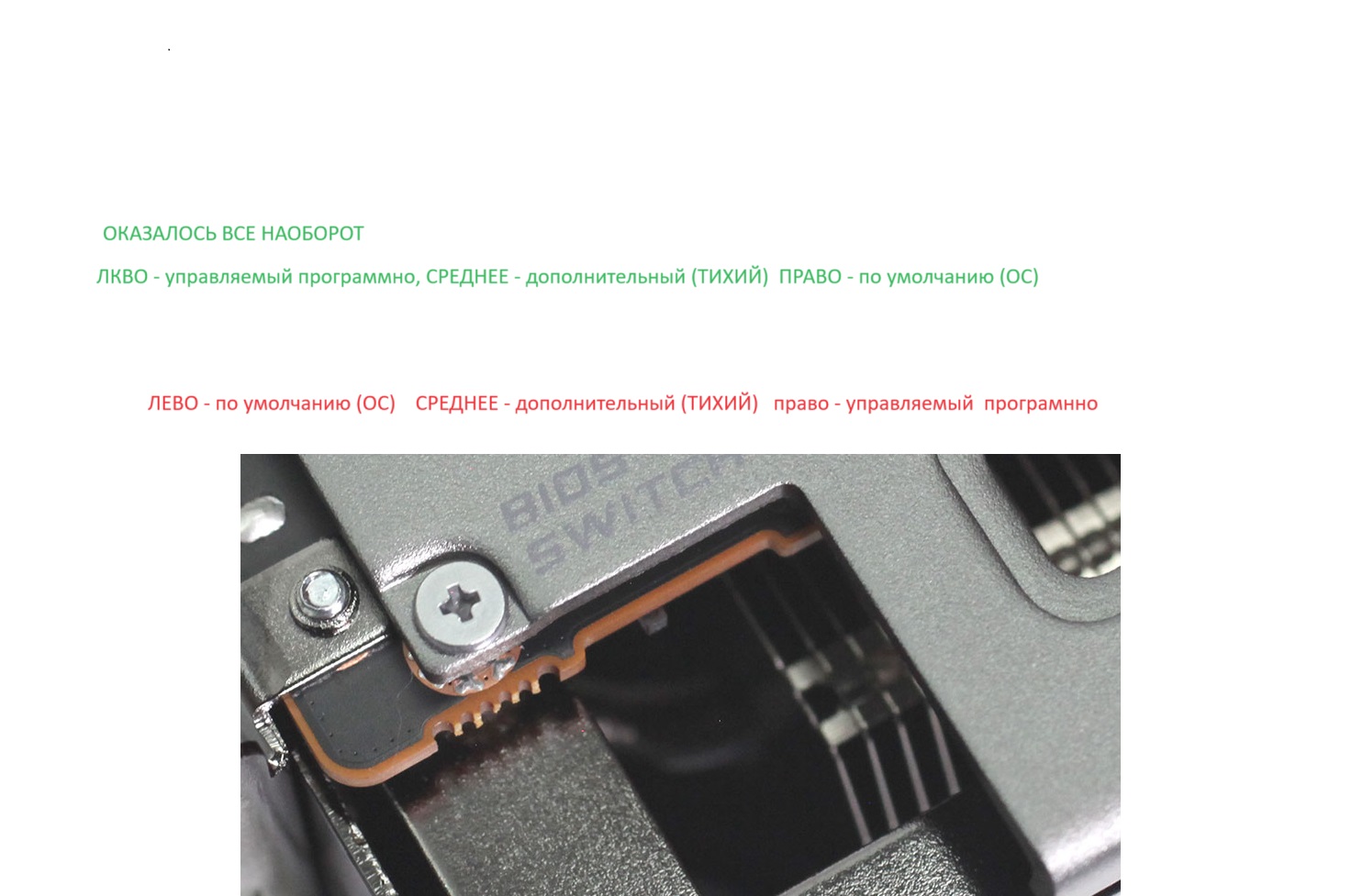решил переключить биос - читаю в обзоре https://www.techpowerup.com/review/sapp ... tro/3.html Переключатель BIOS имеет три положения: крайнее левое = BIOS по умолчанию, среднее = дополнительный BIOS, правое = программно управляемый. В программном обеспечении Sapphire TRIXX теперь можно переключать выбор BIOS, не открывая корпус и не залезая под стол. Смотрю картинку, понимаю так (рисунок ниже) передвигаю ползунок вправо, т.е к передней части ПК - фиг, не работает программное управление, включается ОС биос передвигаю ползунок в среднее положение - включается тихий биос (пониженные частоты) Оказалось все наоборот передвигаю ползунок влево (к задней части ПК) - включается программное управление, переключаешь биос в программе TRIXX_9.7.5 , выключаешь ПК, включаешь, загружается требуемый биос. Т.е. с этим разобрался
