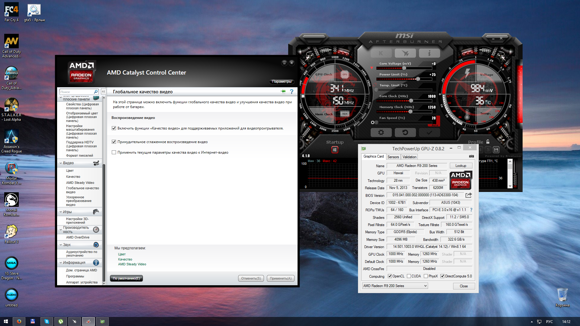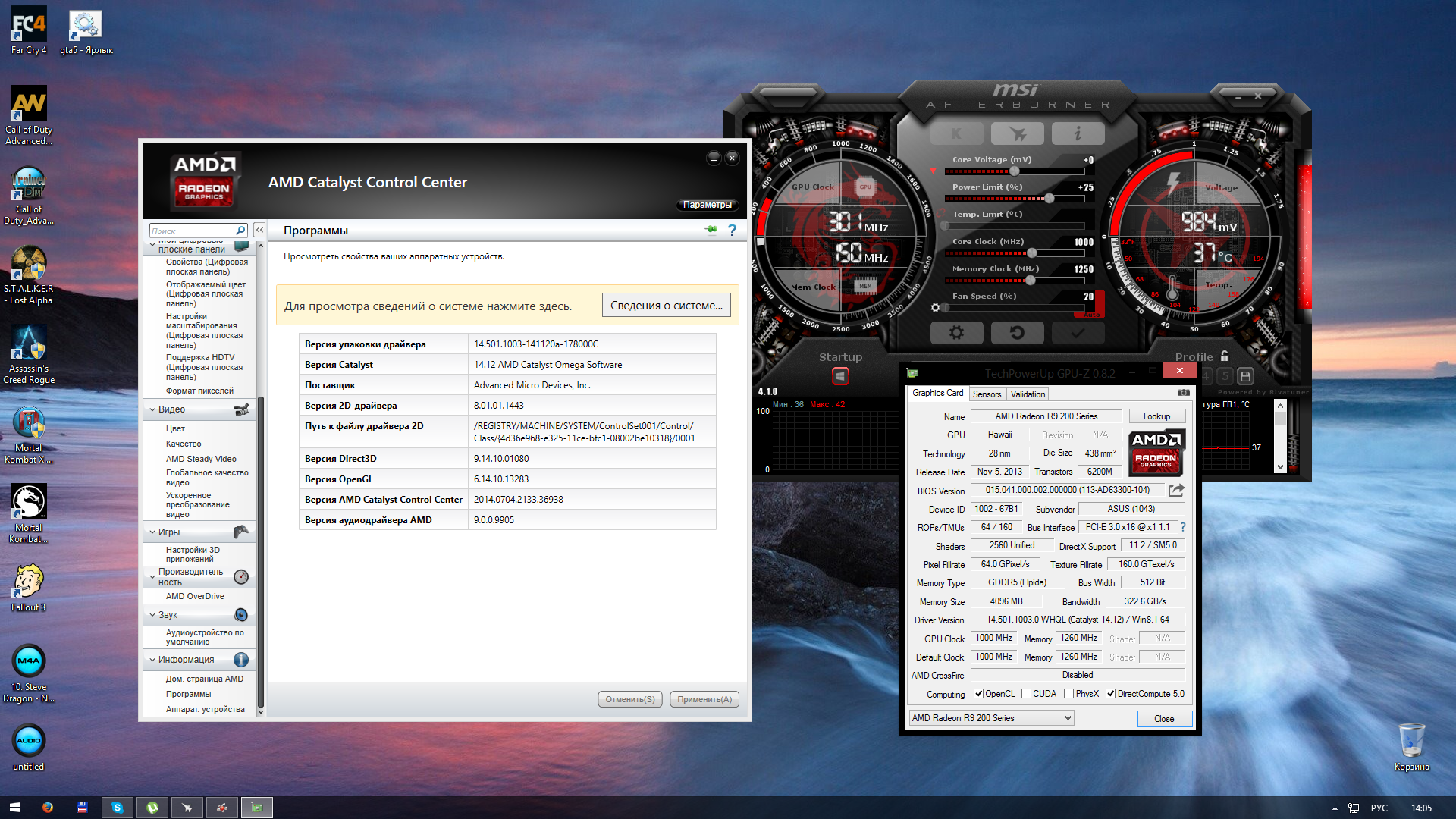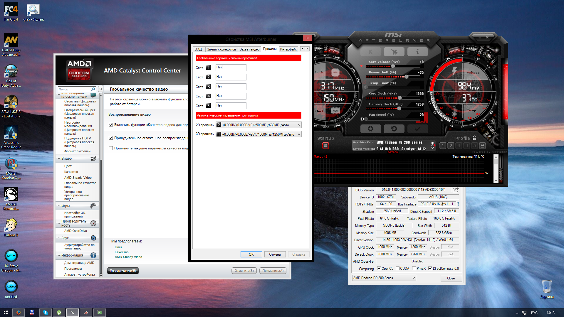 Уважаемые коллеги! вот сижу уже 5-ую минуту с установленным драйвером 14.12! ставил через samdrivers pack, просто решил в очередной раз подергать судьбу за письку... в конце установки драйвера экран как обычно пару раз гаснет, но и как обычно у меня на третий раз погас навсегда. после ресета, аот уже неск минут нет ЧЭ! для меня это нонсенс, грешу на то что у меня профили афтебернер, хотя гпу-з показывает одно, афтербернер другое, частоту как обычно скачут, хотя я сделал авто выбор профилей - приложу скрины. и еще после запуска гпу-з там где показывает режим шины псиЕ у меня менялся режим - вот так - 1.1.1-16.1.1-16.3.0, потом стал 1.1.1, думаю из-за этого и были ЧЭ, но сейчас нету! у кого какие мысли, и по скрину каталист может ли кто сказать, все ли новые функции у меня открыты...
