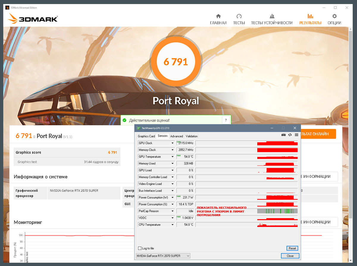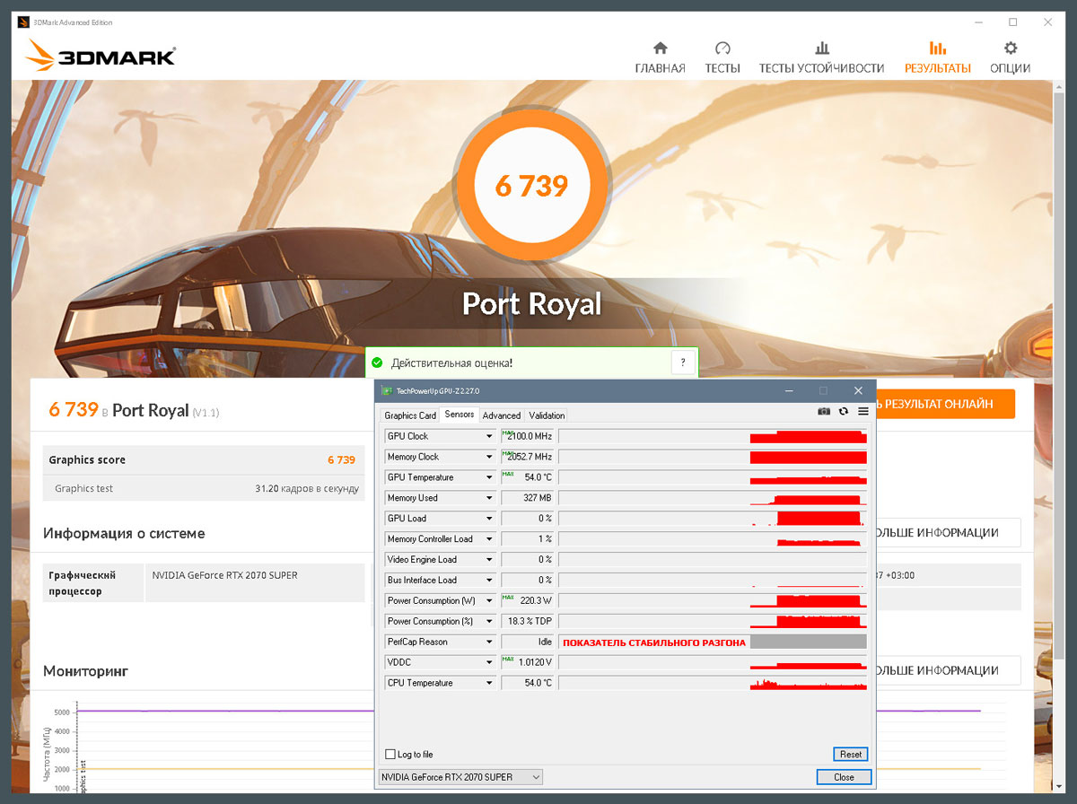 Возвращаясь к Port Royal... мой показатель на СВО: 6952 при 2175MHz, показатель nepranov: 6844 при 2160MHz (снижаем на ступен - 2145MHz), т.е. мой буст +2 ступени (+30MHz) и разница в очках - 108... мой показатель на "воздухе": 6791 при 2115MHz (снижаем на ступень - 2100MHz), т.е. фора у nepranov +3 ступени (+45MHz), но разница в очках - 53...