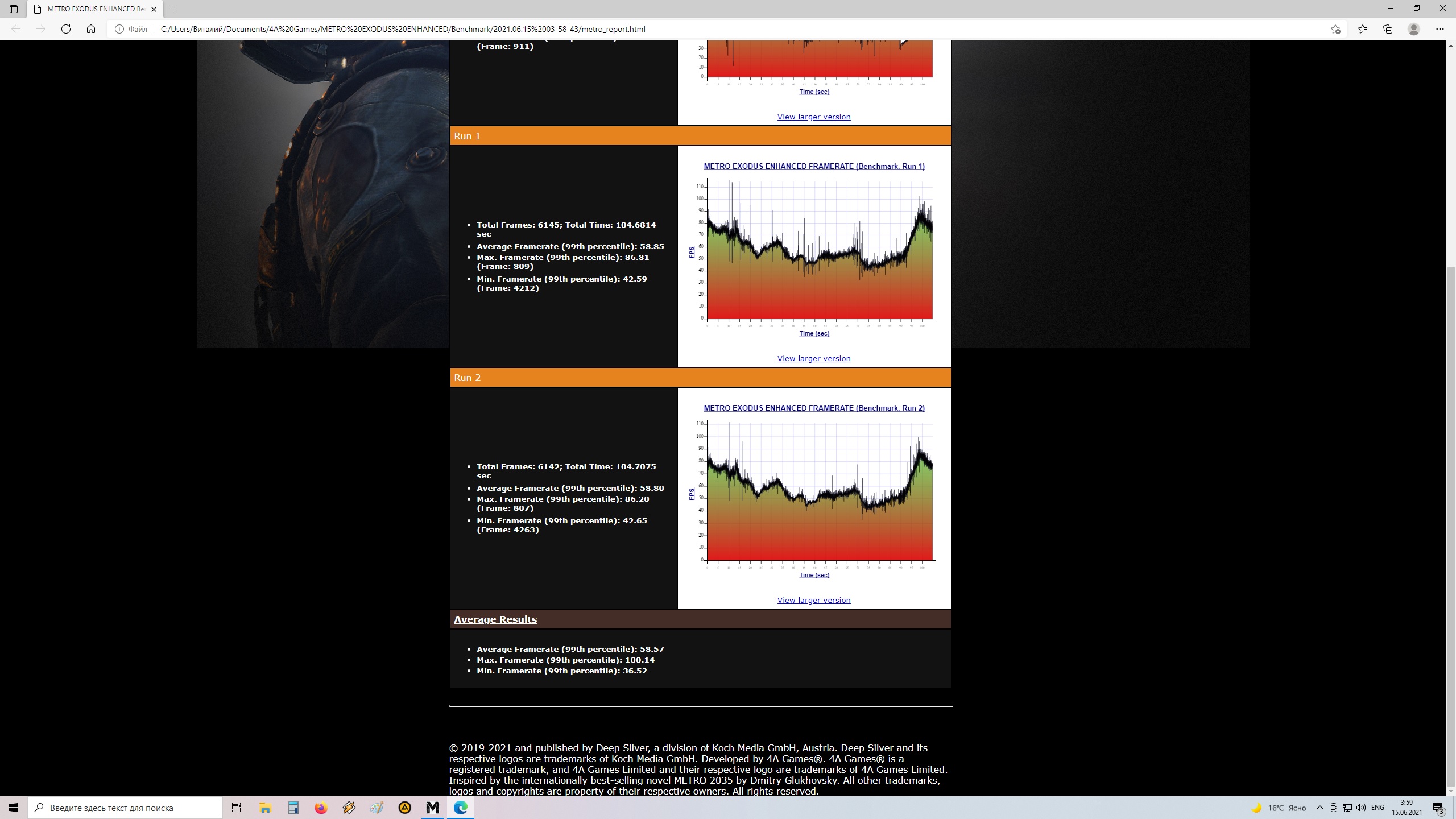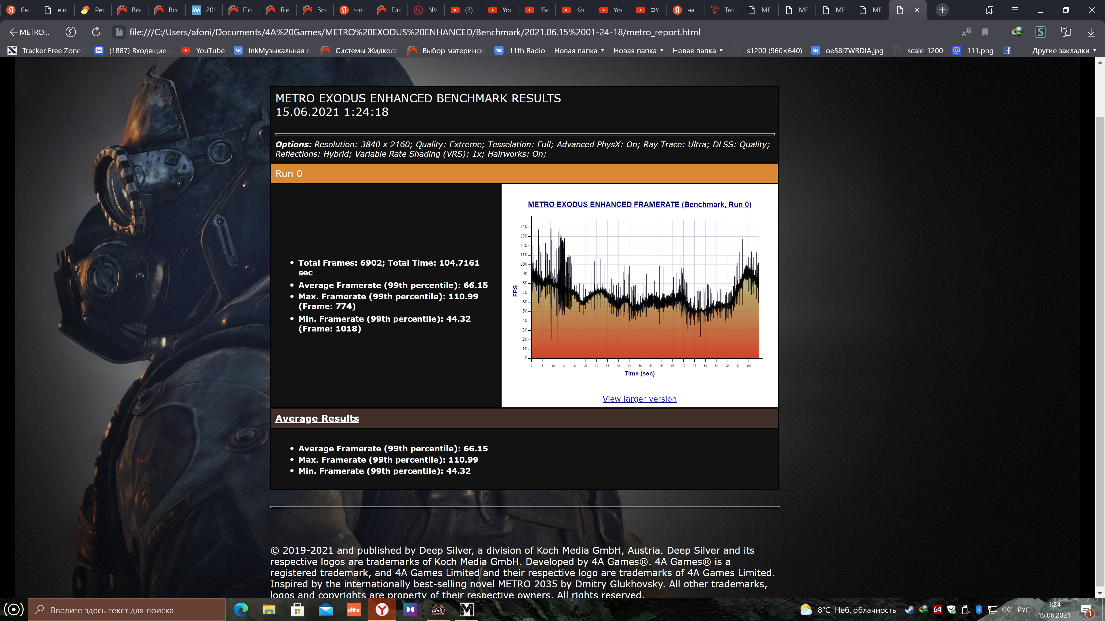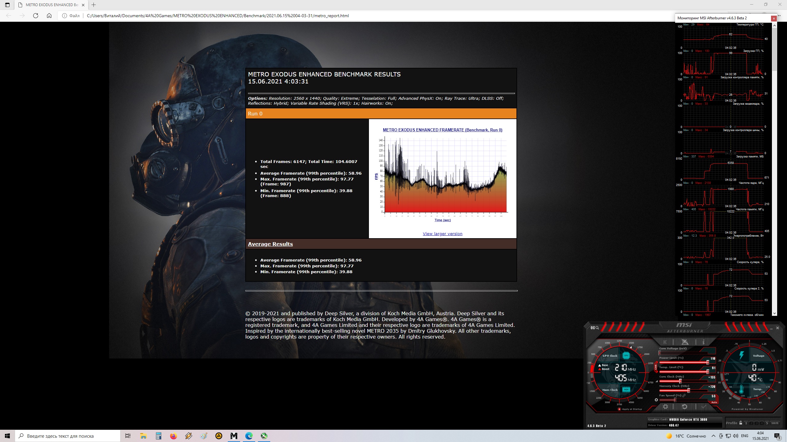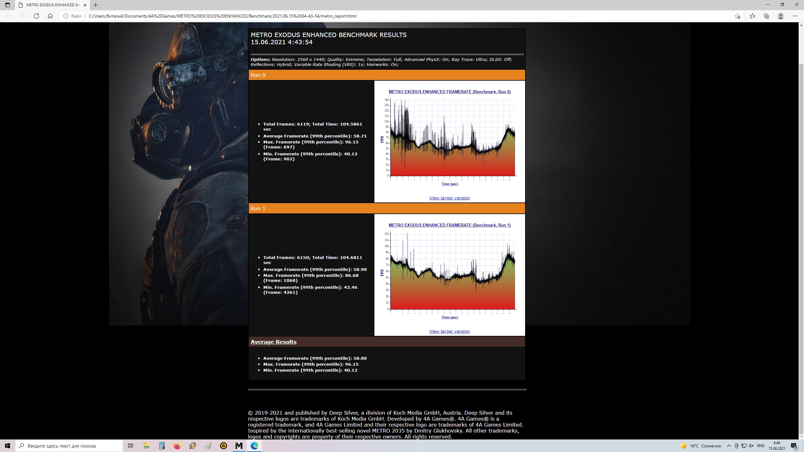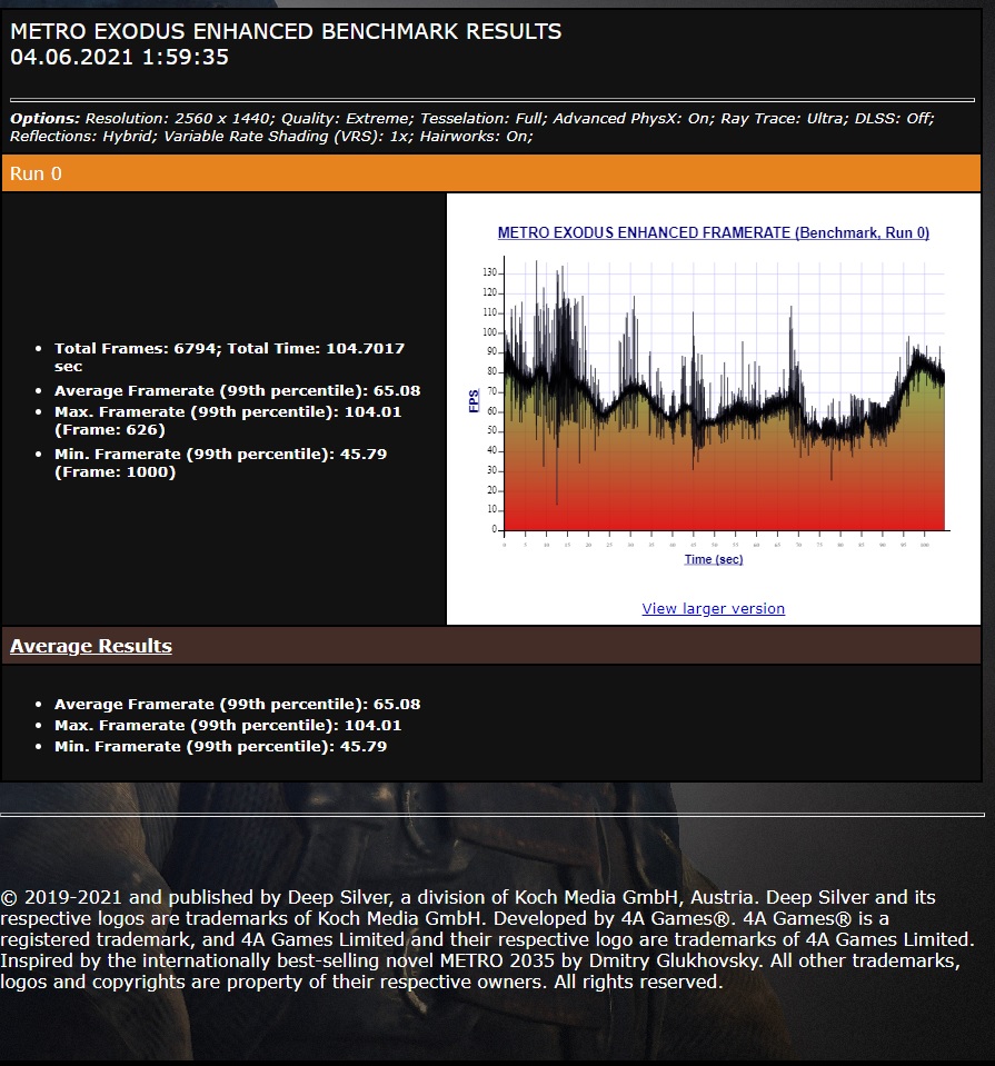 непонятно как ты там выставил настройки hybrid или raytrase надо 2 скрина тебе предоставить с разными настройками и там если у тебя hybrid, не 5 -6 а все 11 а это в 4 к прямо очень даже много 55 в 4 к это очень некомфортно от 60 уже удобоваримо и играбельно с хорошим фреймтаймом в одиночной игре.В сетевых играх у меня в 4к больше 200кадров сейчас стало(заморочился с курвой и это реально работает)...Я понял почему графики не такие ровные у меня ,надо ставить более 3 прогонов, тогда график выравнивается...иза того что юзвери обрезали свои результаты сразу было не понятно сильную разницу в кривой...Кароче надо сравнивать первый прогон ,тогда все на свои места становиться и понятно откуда такая ровная кривая у михайловского.Память успевает исправить ошибки на последующих прогонах.Метро самый правдивый тести имхо.Показывает резултаты твоего труда полностью.и сразу понятно что есть что.Кстати может кому будет интересно после настроек в видеодрайвере на производительность я сел играть в crossout в 4 к и я начал помаленьку добавлять красивости...в итоге пока я все не виставил на красоту было что то не то и игра не радоовала картинкой.Выставлял я все в реальном времени и фпс с 300(к сожалению это ограничитель в игре больше не позволяет настройки все максимальные) упал до 200 то есть.Вырубание анизатропки 16х сглаживание прозрачности и тд и прочие махинации дают +100 кадров но играть не приятно.Я впервые увидел это в реальном времени и было прекрасно видно результат и влияние, на производительность..Можно убрать скачки и получите стабильные +- 80 кадров в игре.Кто хочет попробуйте и убедитесь..клавиша ф11 в игре.Так что если вы хотите результатов в тестах вам надо будет настраивать драйвер.Но тут уже другой вопрос а почему бы всем не выставить драйвер на красоту и затестить с красотой?)))