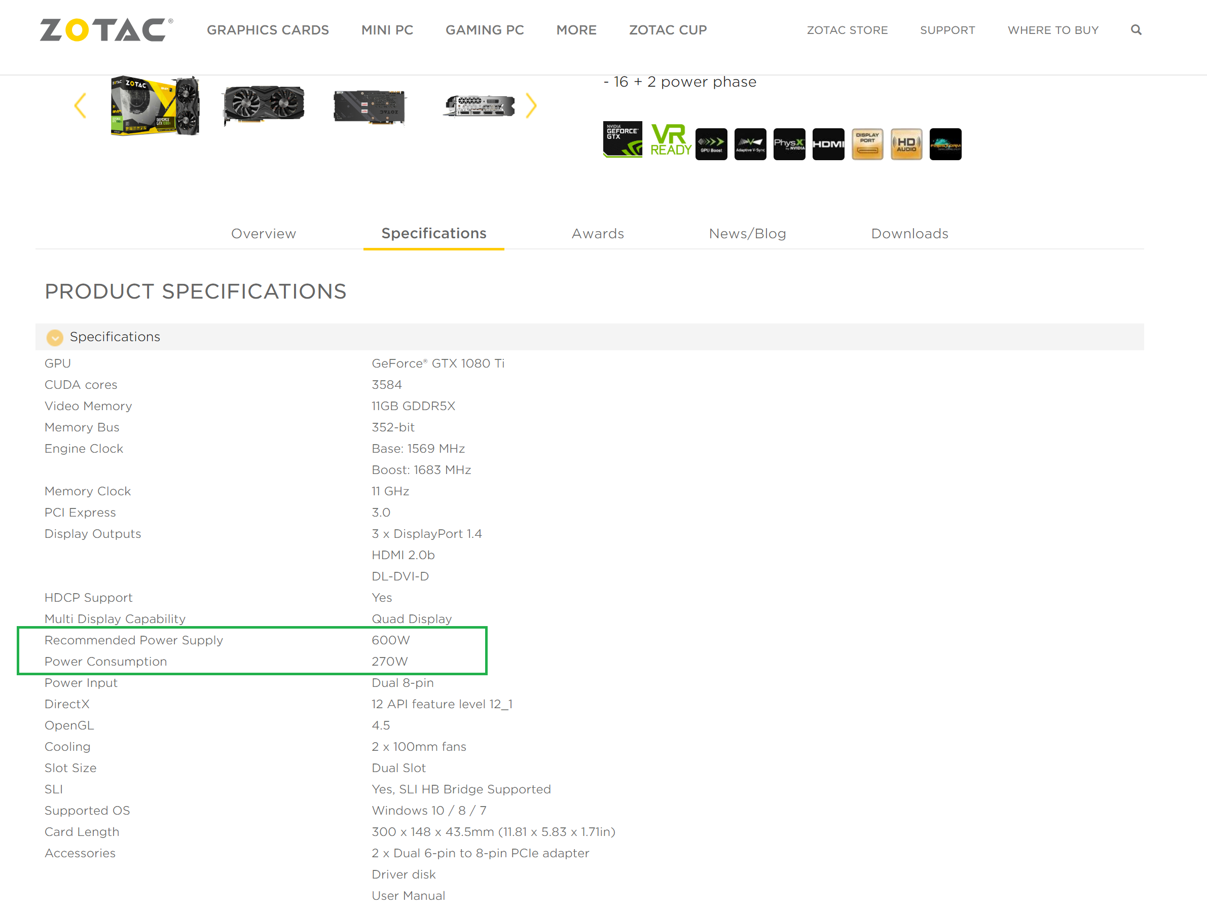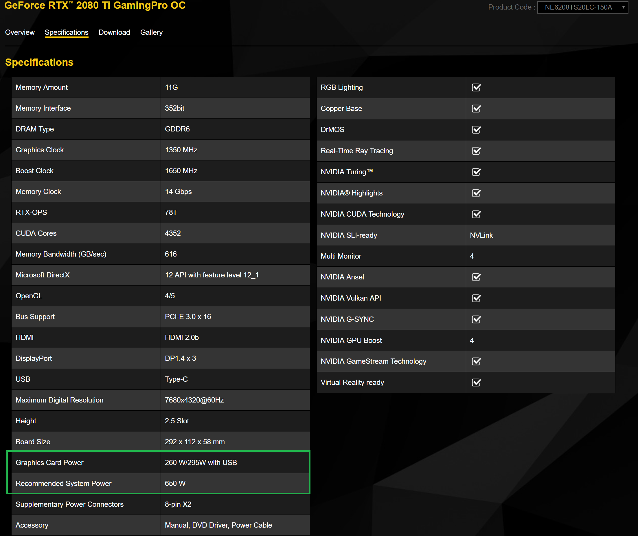 Вот спецификация с вашего сайта по RTX2080Ti Gaming Pro OC