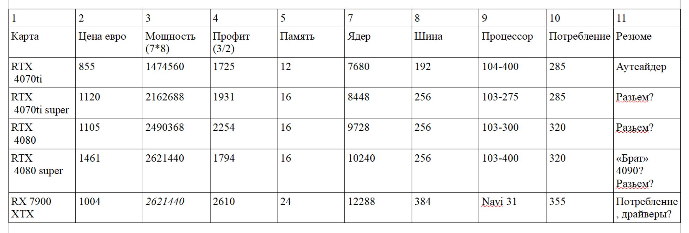 1. RTX 4070ti не нравится самым низким профитом, памятью впритык, шиной. 2. RTX 4070ti super дороже самой дешевой RTX 4080, но уступает ей в профите/ядрах. 3. RTX 4080 super - второе место с конца по профиту. ИМХО это "брат" 4090 - тем кому нужна "абсолютная производительность", но на 4090 не хватает денег. 4. RTX 4080 и RX 7900 XTX - два варианта между которыми стоит выбирать из представленных вариантов.