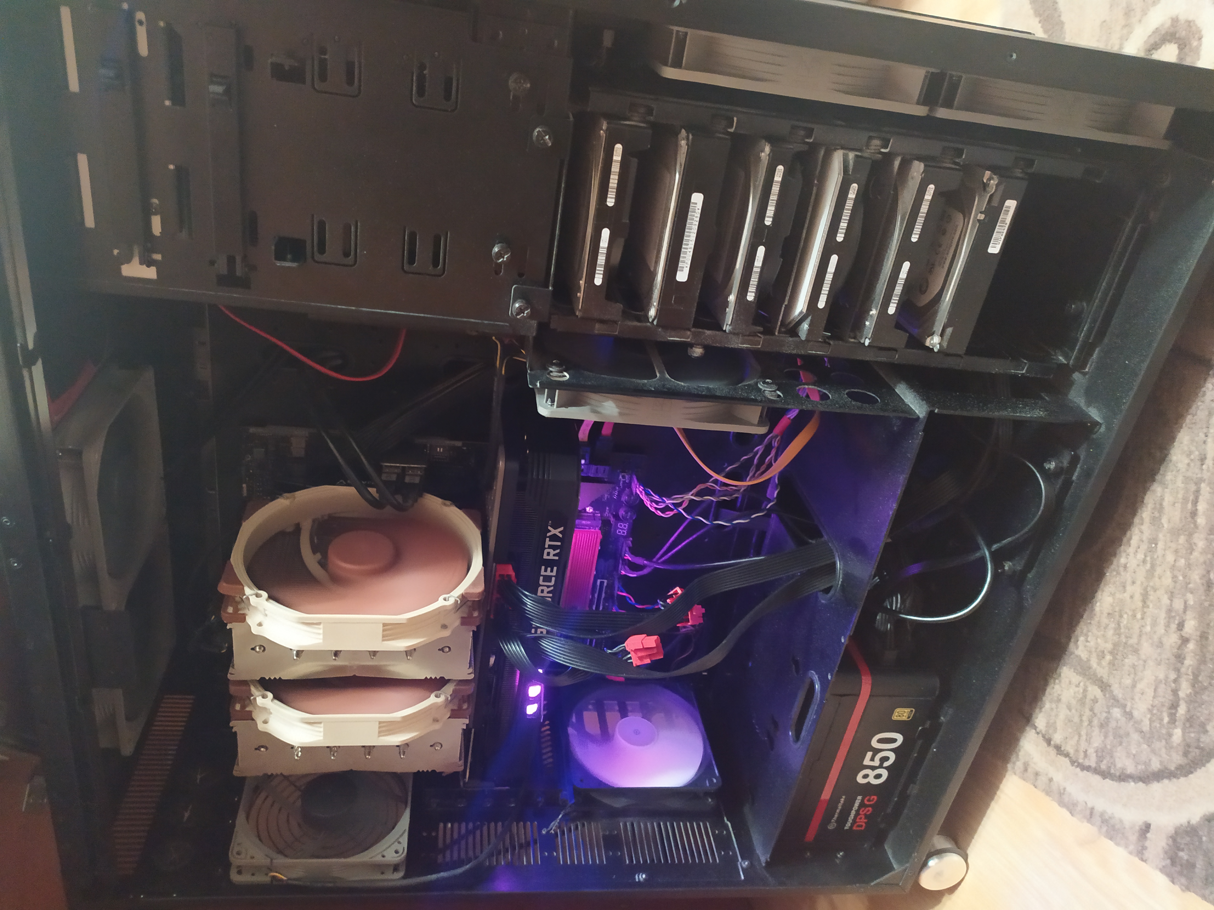 Понятно, т.е в моем корпусе и gamerock будет за 80+ переваливать. У меня корпус под столом, крышка передняя снята, что бы был приток воздуха (вдув: спереди 2 вертушки 140 и еще одна 120, внутри еще один 140 дует прям на видяху, выдув: сверху и сзади 2x120), возможно надо приспособить 120 снизу на вдув, но будет ли толк. Так вот, quake rtx выжирает все) карта долбится в лимит, темпа 82-83. Со снятыми боковыми крышками срезается 4-5 грудсов (77-78), андервольт дает еще -2,3 градуса, но опять же зависит от игры.