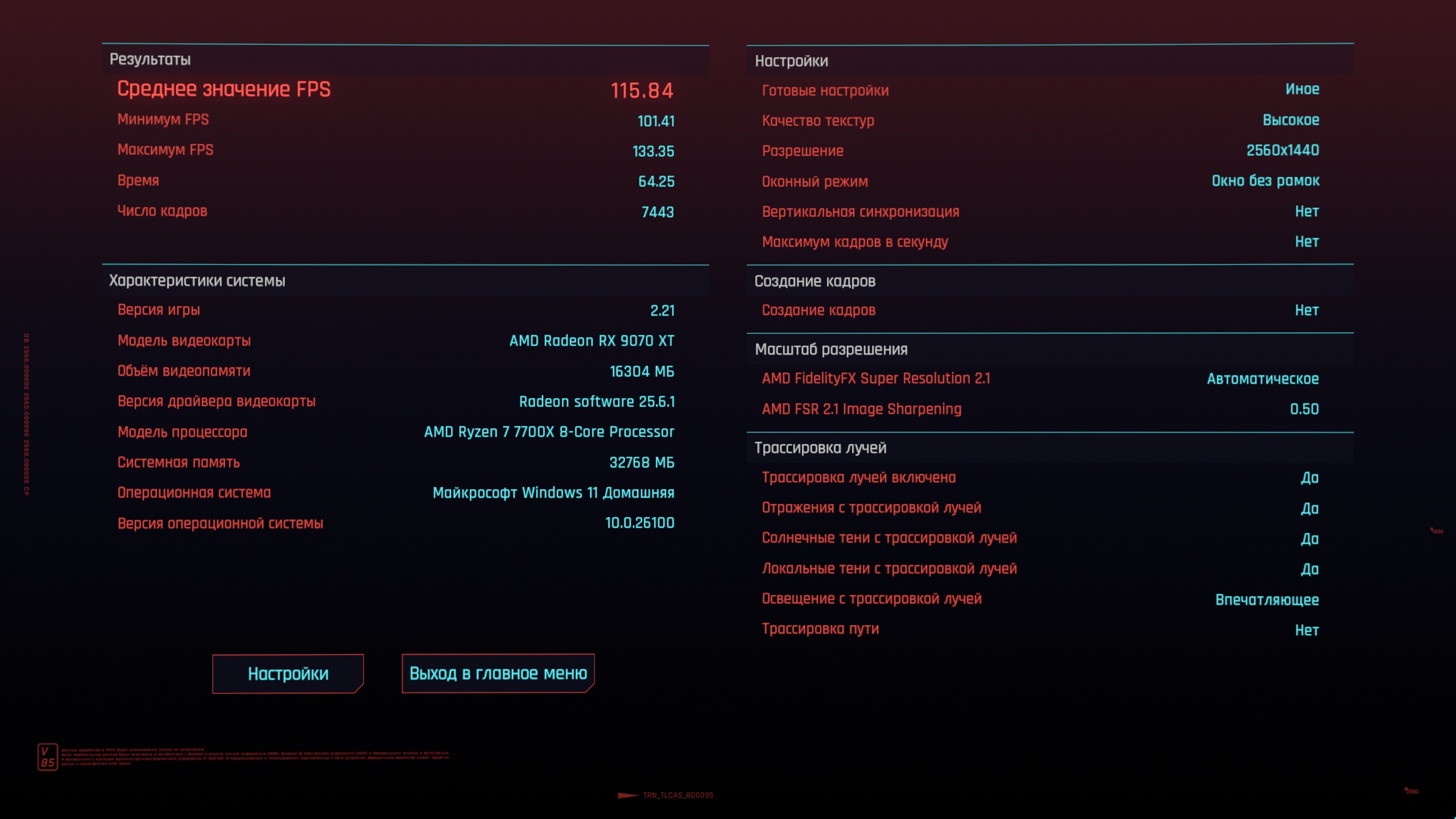 Давно уже прошел киберпанк на прошлой видяхе и забыл. А сейчас поставил чтобы сравнить с твоими результатами. Если бы играл в настоящий момент я бы даже PT включил, т.к. 9070 его вывозит в 60+фпс, в отличие от красного флагмана из каменного века