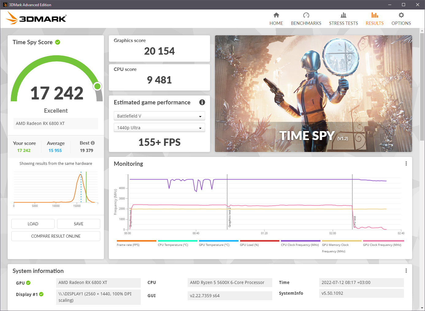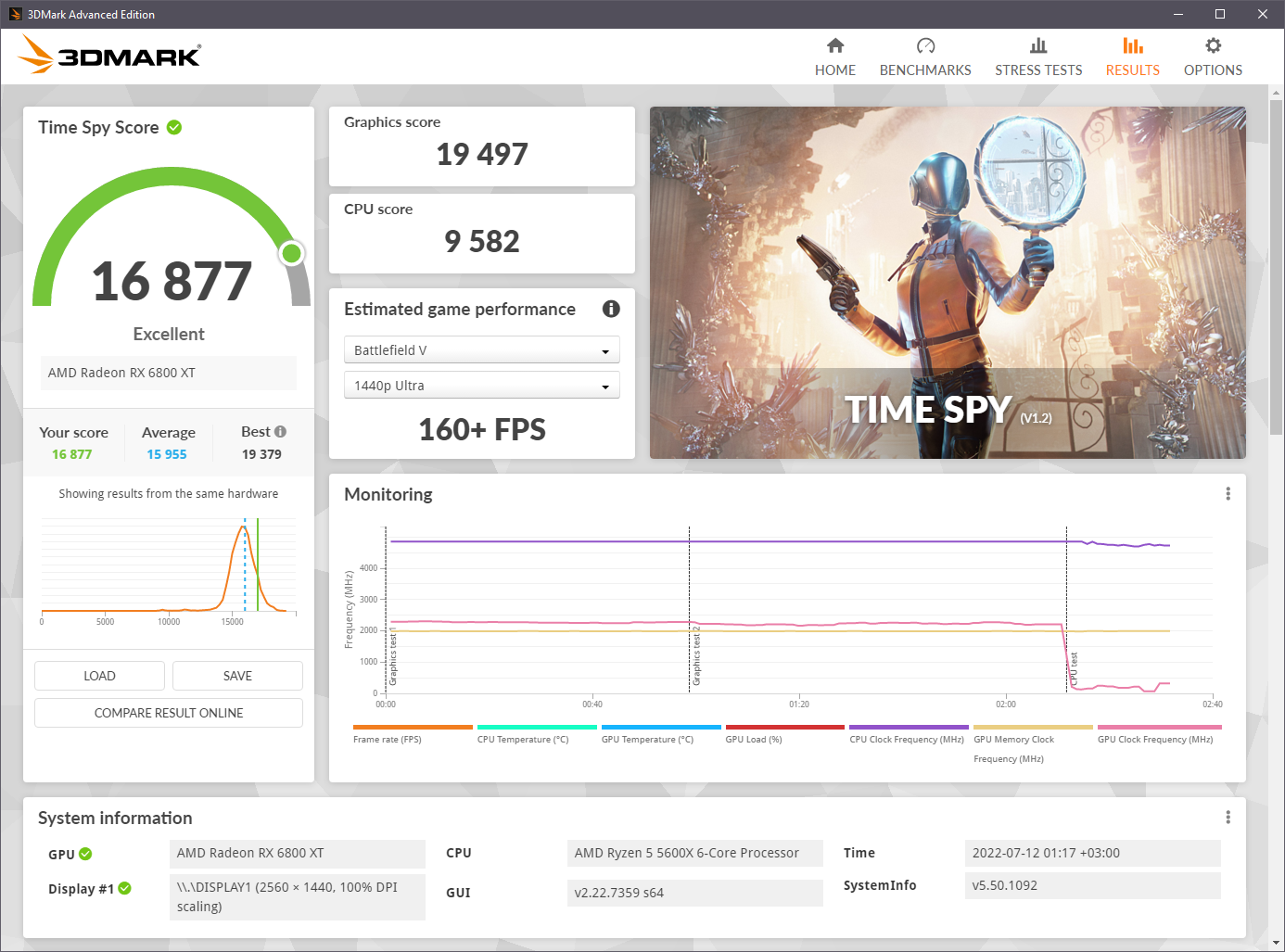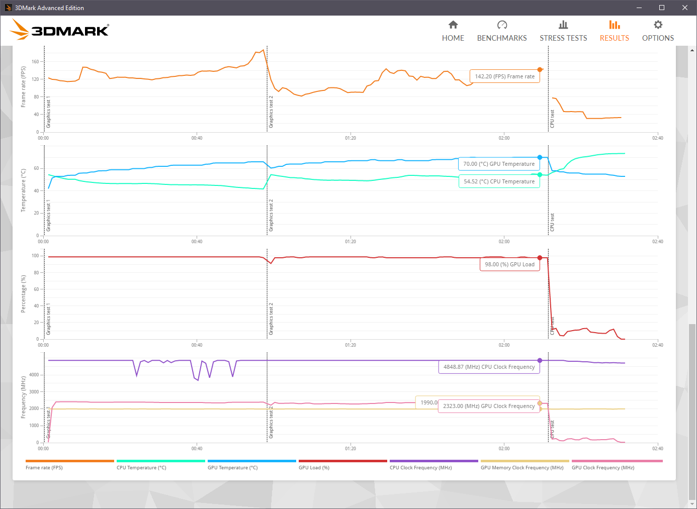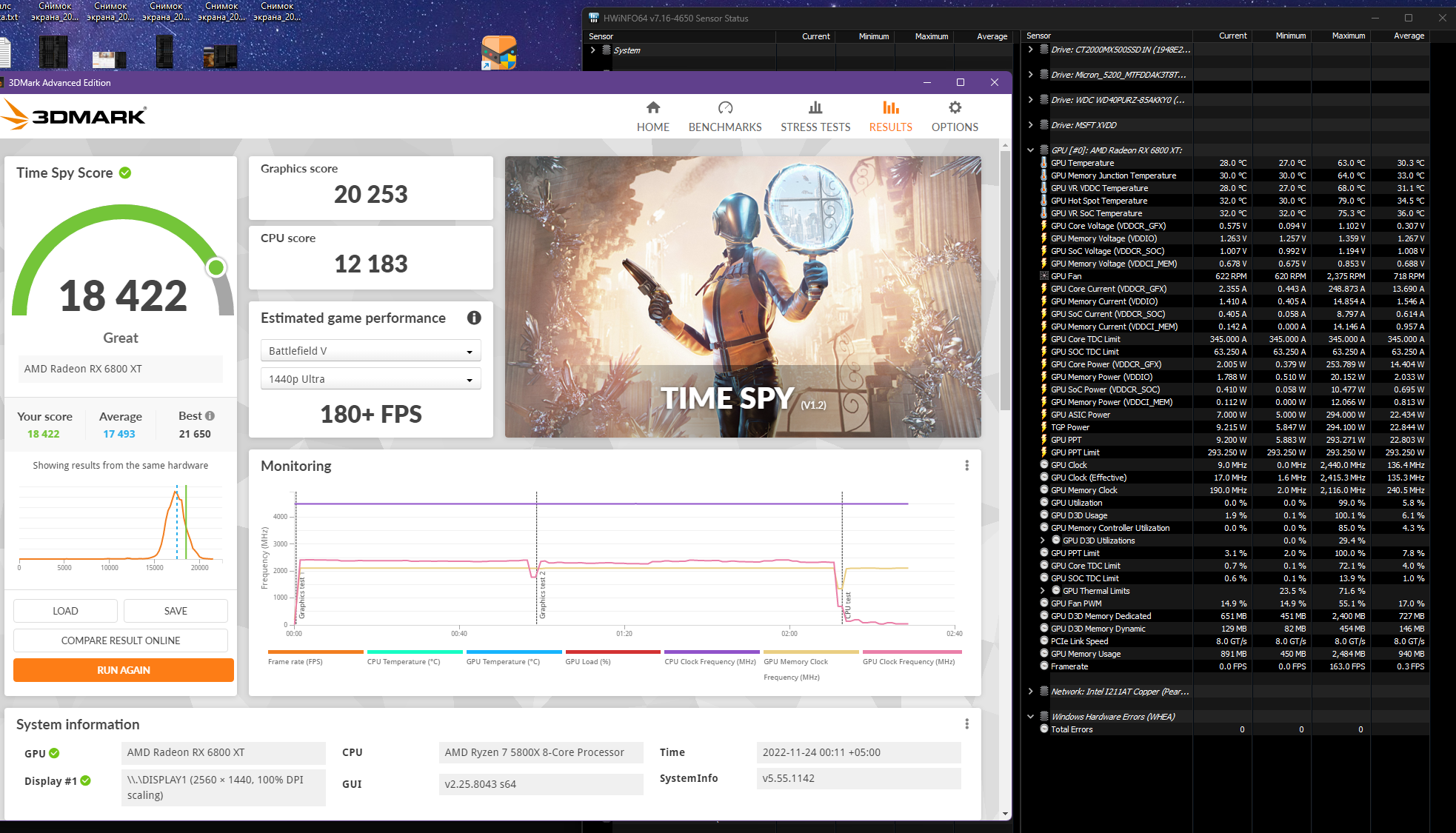 Чото я не пойму, чип чтоли такой деревянный? Когда моя карта с али пришла, особо не успел ее погонять, т.к. уже на следующий день водоблок поставил. Тут два прогона со стоковым кулером с вертушками, без HWInfo, но телеметрию 3dmark взял из сейвов. Один полностью сток, второй андервольт типа 1075. У меня там температура GPU была, как у тебя HotSpot )):