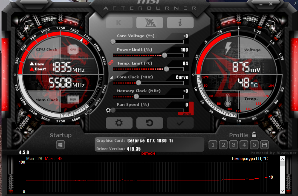 В чем профит при таком напряжении?? Суть же в том, чтобы найти оптимальное и полностью стабильное соотношение частота/напряжение (читай, максимально возможная частота при минимальном напряжении). Таким, образом я нашел достаточно неплохое соотношение, при котором производительность выше чем этот же параметр при заводском разгоне карты, а потребление электроэнергии и температуры меньше, чем при стоковых частотах.