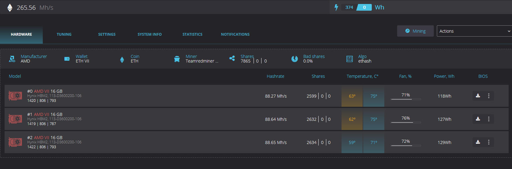 Никаких сказок. Новый майнер вышел под АМД, умеет забивать буффер на всю память (на все 16гб). По итогу радеоны 7 прилично забустились. Есть скрин очень эффективного режимам на 7. 88+мх при том, что карта в сильном даунклоке и даунвольте. Память убавлена с 1000 до 806, ядро с 1800 до 1425. Занижены SOC и FLC. Я думаю, очевидно, что просто в номинале карта уходит за 100. При этом часть VII берут 1300 по памяти. Но это редкость. Все упрется в ядро на самом деле. https://forums.overclockers.ru/download ... &id=214953