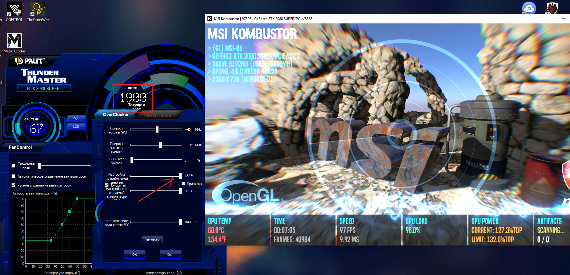 В играх - до 70 максимум!!! Обычно 62-64 градуса. Обороты 1700, там видно. Частота 2085. Память 9100 (18200) После 5-7 минут Комбустор больше не греет карту. и 317 W.