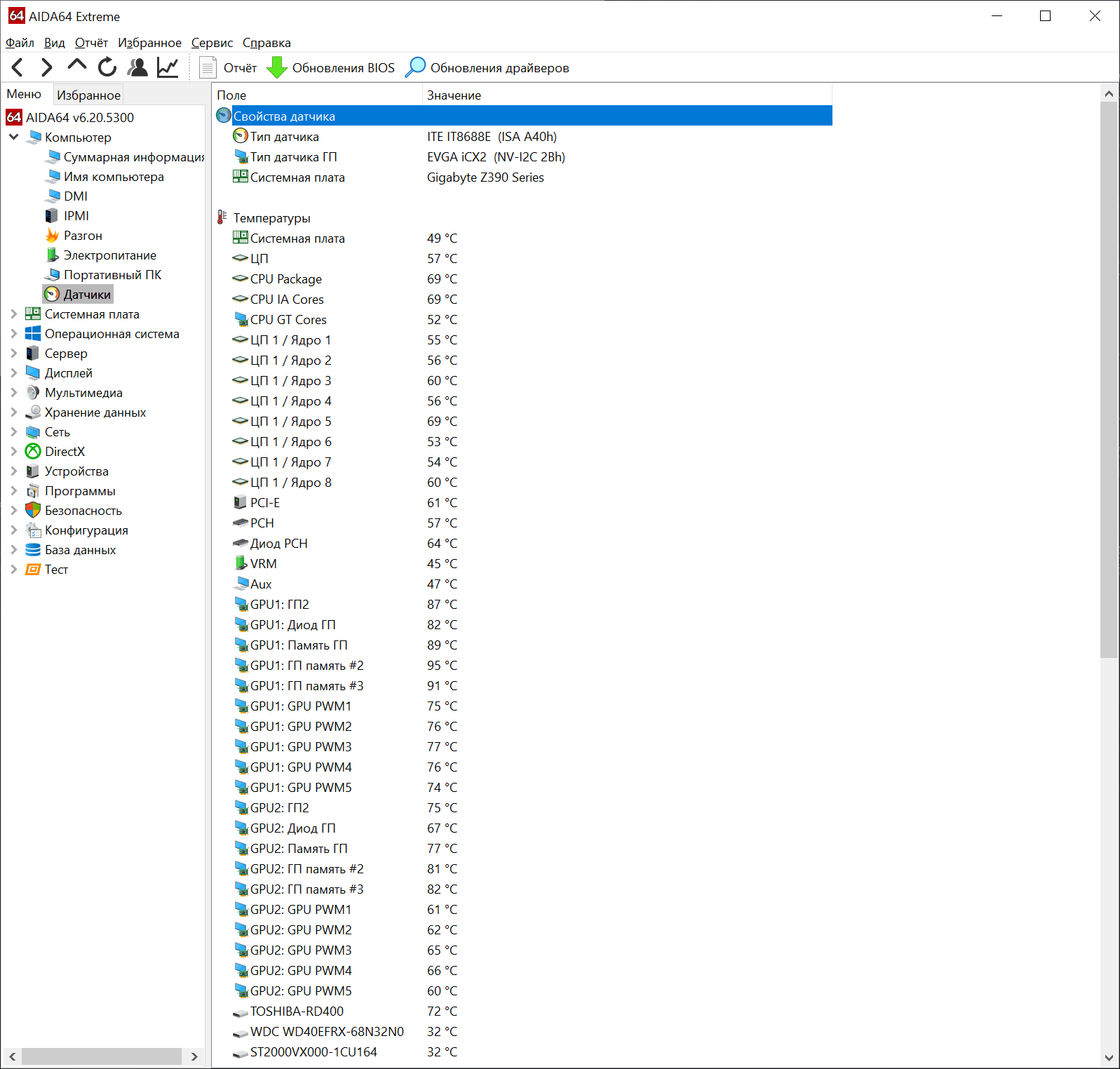 Привет, есть две 2080 ti evga xc2 ultra, греются они при автоматическом управлении вентиляторами примерно как на скрине При управлении кулерами через EVGA Precision X1 есть нюанс, что прога работает очень криво - вылетает периодически, настройки не применяет и тд msi afterburner вторым кулером управлять не может Вопрос скорее в том, какие температуры для видеокарты безопасные? Память samsung, спеки для нее не нашел (для микрона максималка 95 градусов) Еще интересно, что при темпах как на скрине обороты в районе 85-87% в этом автоматическом режиме В общем, очень интересен ваш опыт
