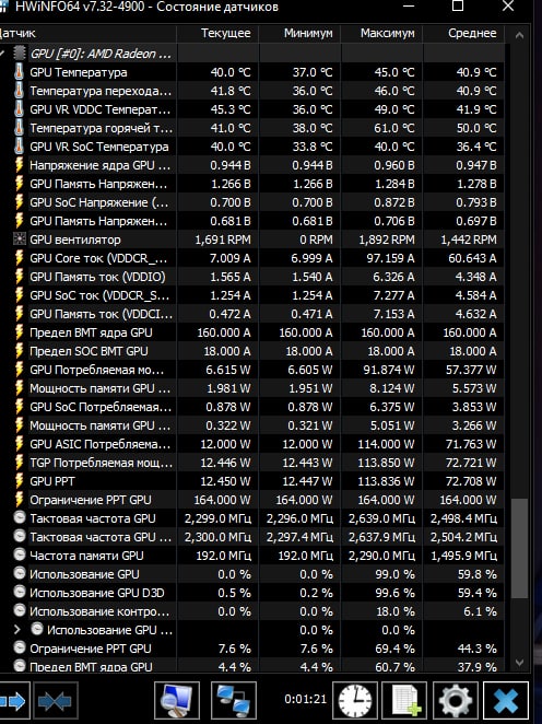 Т.е когда например - частота 2300-2400 на чипе при 99% гпу и обороты стабильно на 1500-2000, хотспот в этом режиме -у меня в стоке от 82 до 86-87- средняя около 85, как только нагрузка начинает плясать, падать частота, обороты вентилятора -я переключаюсь альт-таб или между экранами с слабой нагрузкой. Потом при возврате 3д, могу зафиксировать 92С, это не означает что там всегда столько или что-то плохое)))- просто пик. Смотрите среднюю температуру.