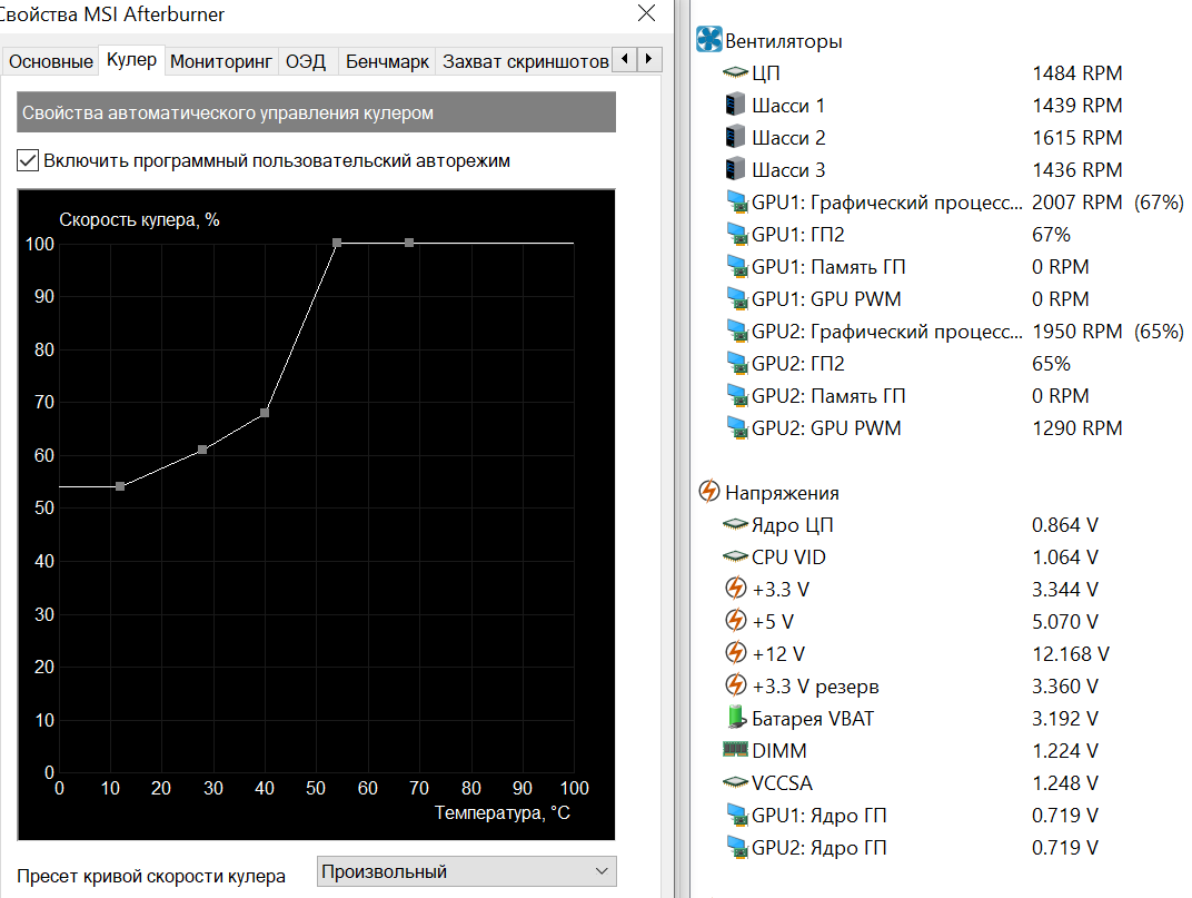 Michailovsky У evga xc2 есть такая штука, как icx2. Два вентилятора, два контроллера. Один - охлаждает ядро и память, другой - vrm. Тот что охлаждает ядро подключен через стандартный контроллер nvidia, он доступен для управления через msi afterburner, второй подключен к отдельному контроллеру evga и не управляется. Мало того, когда я принудительно выставляю обороты на основном кулере, видеокарта перестает в автоматическом режиме управлять вторым и он выключен, т.е. vrm без охлада. Precision X1 дико глючный, но он умеет управлять обеими контроллерами и альтернатив нет)