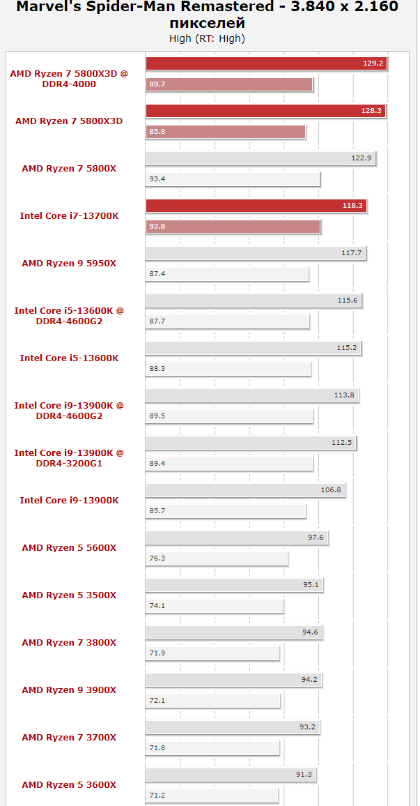 Ну 1080 смотреть особо смысла нет, те кто в таком разрешении играет, у них топовой карты не будет, а значит будет упор в нее. А в 4К там разница с обычным 5800Х "целых" 4% в пауке. Так что опять же этот X3D переоценен.