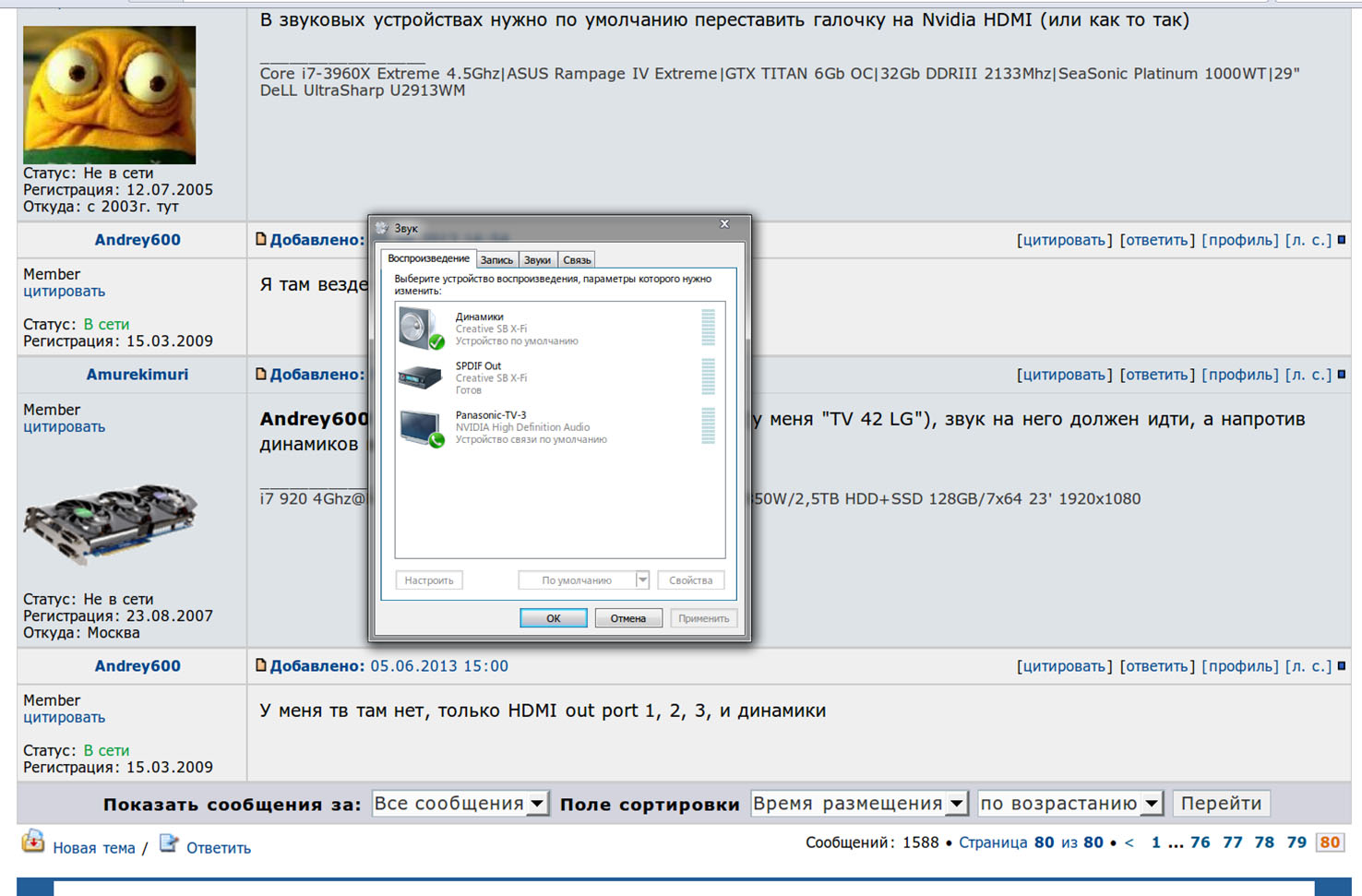 Кликаешь правой кнопкой мыши на значке динамика в нижней правом углу экрана...потом выбираешь "устройства воспроизведения"..затем - делаешь скриншот кнопкой "print screen" .... вставляешь картинку в любом графическом редакторе (ctrl+v) и постишь сюда..