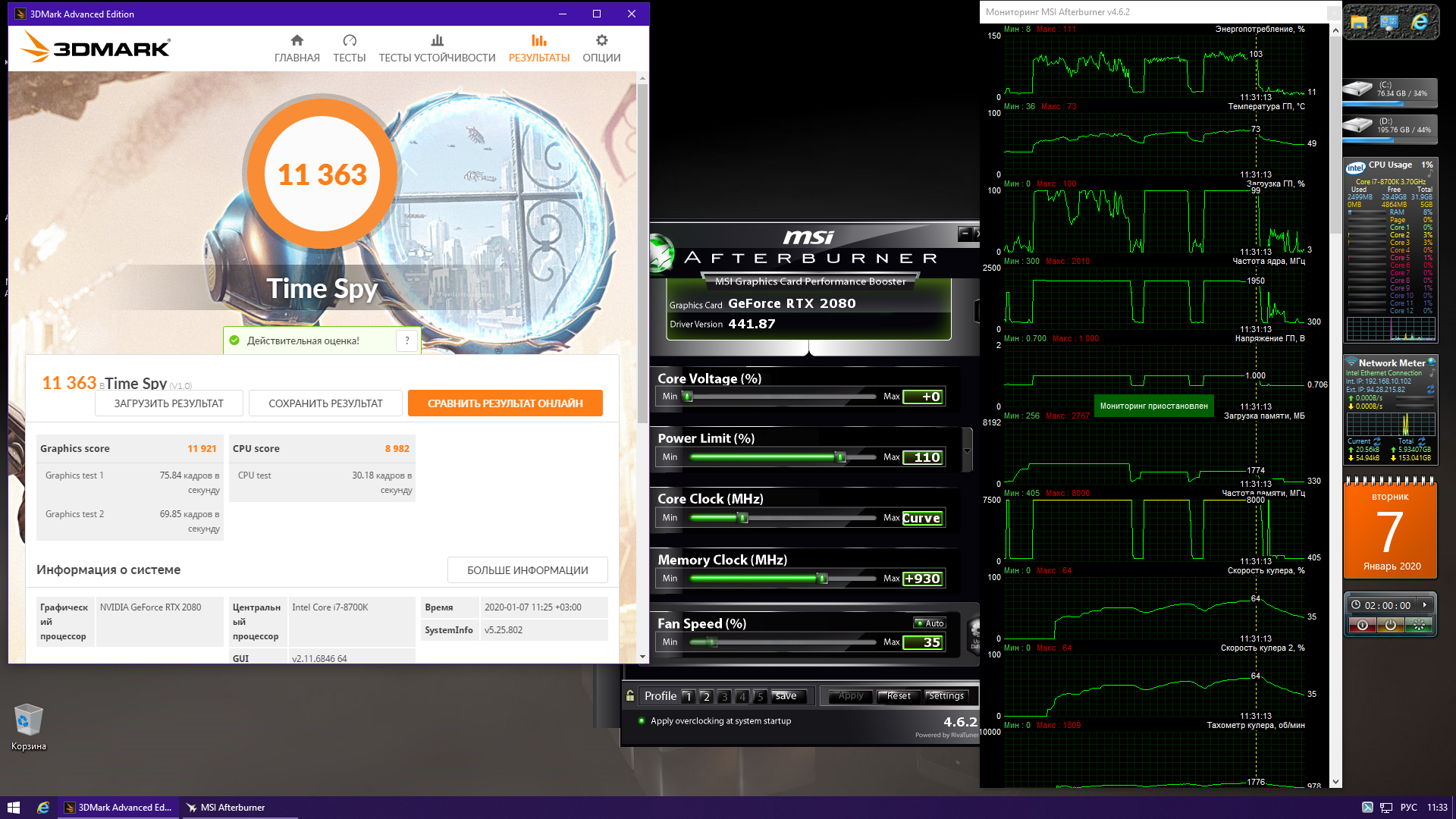 EVGA GeForce RTX 2080 XC Black, упаковка была чуть мятая, но с виду новая нераспечатанная. всю комнату завоняла своим специфическим запахом. По памяти примерно 15900, микрон. Ядро в среднем 2040-2055. В неоне разгон дал прирост с 6500 до 7200. Fire straik прошла прям хорошо https://www.3dmark.com/fs/21461222, но это исключение. Бублик на таких параметрах виснет. Time Spy https://www.3dmark.com/spy/10050856, после FS стал вылетать с ошибками, обновить не могу(. Мне больше другое странно: нашел на форуме https://forums.evga.com/EVGA-GeForce-RT ... 58793.aspx, а меня в Precision X1 PL можно повышать до 112%. А по ссылке типа до 130% возможно. Bios от 23.10.2018, версия 90.04.23.00.8E. По серийнику можно как-то определить дату чипа без регистрации и смс? начинается на 1812.