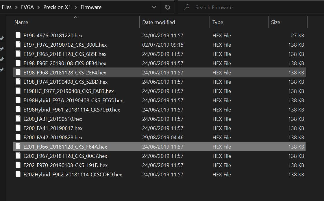 Pavel81 У evga видеокарт бывает 3 прошивки - bios (шьется nvflash), led firmware, ixc2 firmware. У kingpin и гибридов вроде еще одна прошивка. Вот биосы биосы как раз не особо интересны - качество работы проприетарного говна evga определяется остальными прошивками. PX1 на старте пытается обновить и LED и iCX2 прошивки. Они хранятся в папке PX1 (скриншот ниже). У каждой карты есть ее номер, вот у XC2 Ultra это E201. Для нее последняя прошивка это E201_F966_20181128_CKS_F64A Новые прошивки поставляются с новыми версиями PX1 и им же обновляются, а самостоятельно можно обновить только через EVBot Flash Tool. Но у меня оказалось, что одна из карт вышла с завода с прошивкой более новой, чем самая последняя доступная в PX1 - 6B Подкрутив скрипты FlashTool c этой страницы https://www.evga.com/support/faq/FAQdet ... aqid=59742 оказалось что можно легко шить эти прошивки, вот можно поставить еще более старую 4E, которая была перед 66 (но PX1 предложит обновить ее обратно до той версии что есть у него - 66й, что я и сделал. Вот жду этот один файл, так как на 66 у меня icx2 выключается.