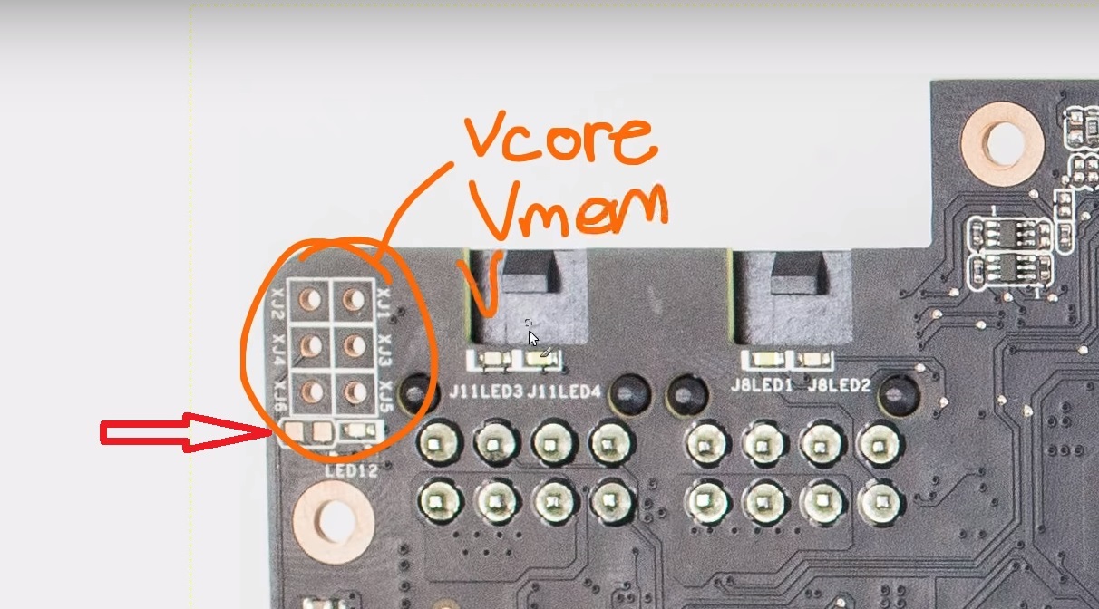 Это точки вольтмода, что бы не паять на самих элементах. Актуально только для азотчиков. Nvidia потребовала убрать поясняющие надписи и теперь там XJ* и он не знает, какие за что отвечают. Надеется, что кто-нибудь их асуса пояснит про них.