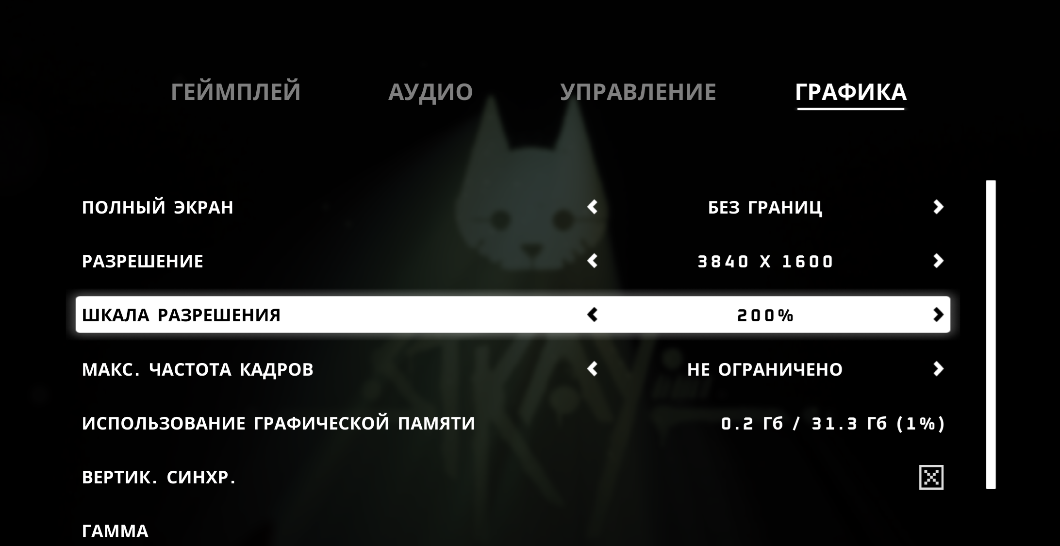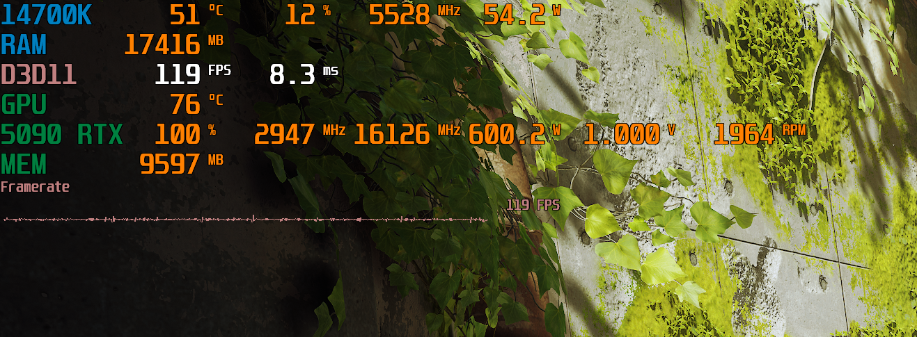 я обычно тестирую на стабильность и полный жор карты с помощью маленькой игрушки про котика Stray, она способна нагрузить любую карту на 100% надо только выставить в настройках 200% шкалу разрешения как видно 5090 выедает весь лимит на 600 ватт (тут профиль 3300@1085mV)
