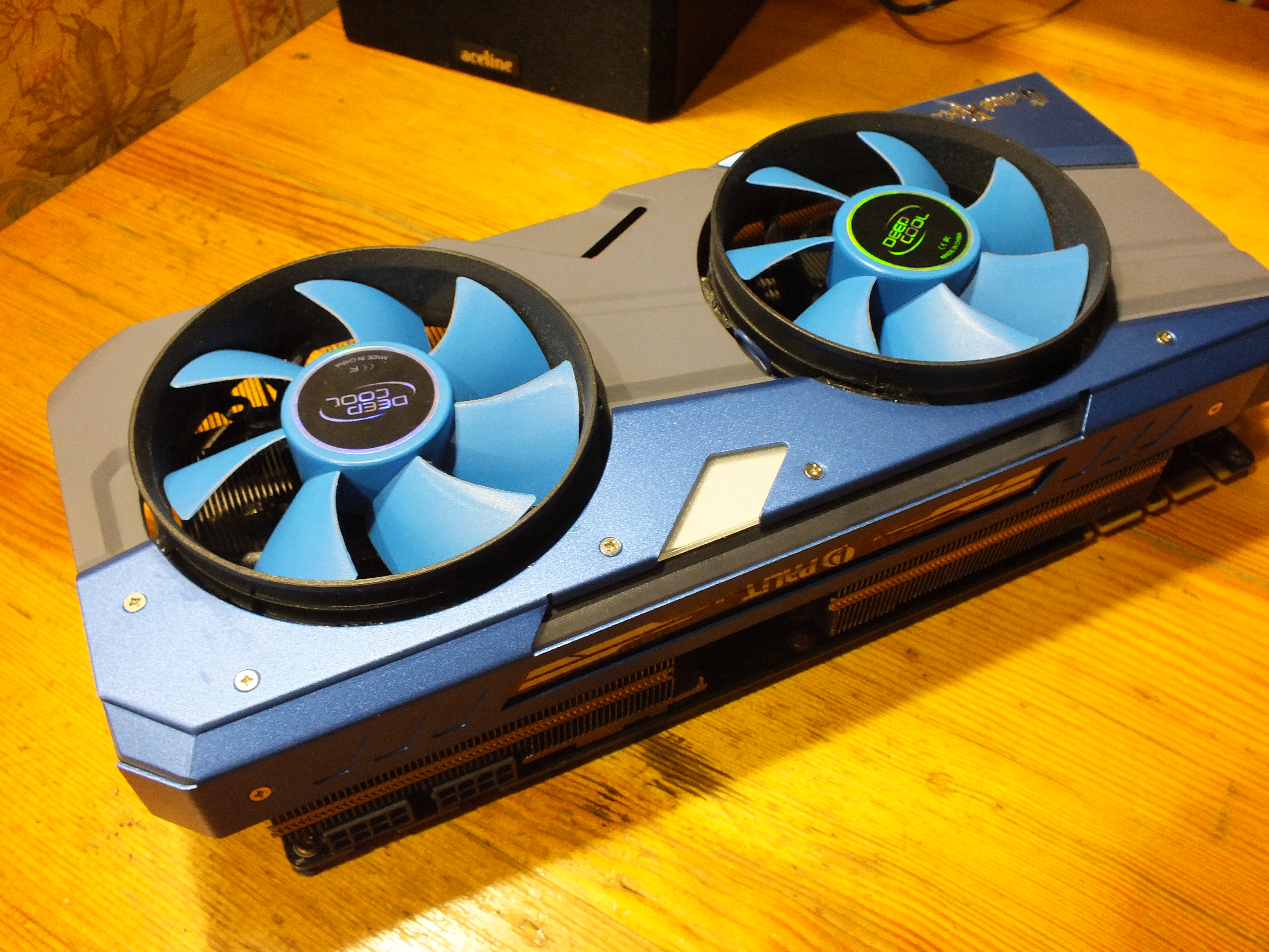 Вертушки от кулеров Deepcool Theta 21 pwm. Выбирал по скоростным характеристикам, хотя можно брать и от других моделей. Функция стоп-фан с ними не работает, но мне так даже лучше. Теперь не приходится ставить АВ в автозагрузку, они сами на минималках вращаются. Охлаждают эффективнее родных вентиляторов. Не намного, но разница ощутима. Крепил при помощи резины. Если присмотреться, то между вертушками и корпусом её кусочки видно. У меня в наличии была только 2,5 мм потому не очень плотно вставала. Пришлось перед тем как утолкать в щель, намазать суперклеем. Если брать резину толщиной 3 мм, то клеить не надо. Только на трении будет держаться мёртво.