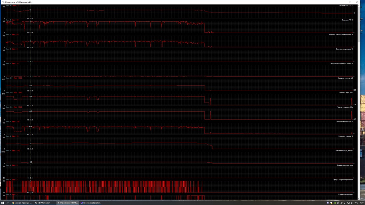 Температура 71C', скорость вертушек не большая, загрузка в норме. Игра Far Cry 4, вылет из игры был. По графику энергопотребления что-то мне кажется, что блок мозги крутит. Хотя установлен TR2 RX 1200 Bronze Видеокарта GTX1080Ti Palit Super JetStream.
