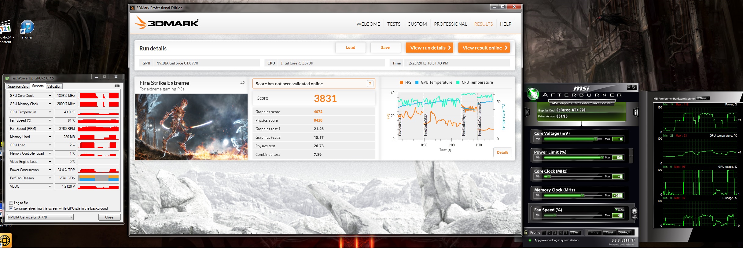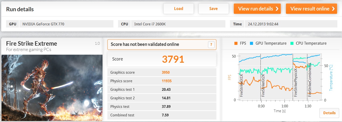 Прогнал FireStrike Extreme на @1306 и 8000 память, ожидал большего если честно, сравнил с резалтами на двух страницах назад на 680 и у меня оказалось меньше *( Хотя должно быть больше, так как 770 это та же 680 только с быстрой памятью...