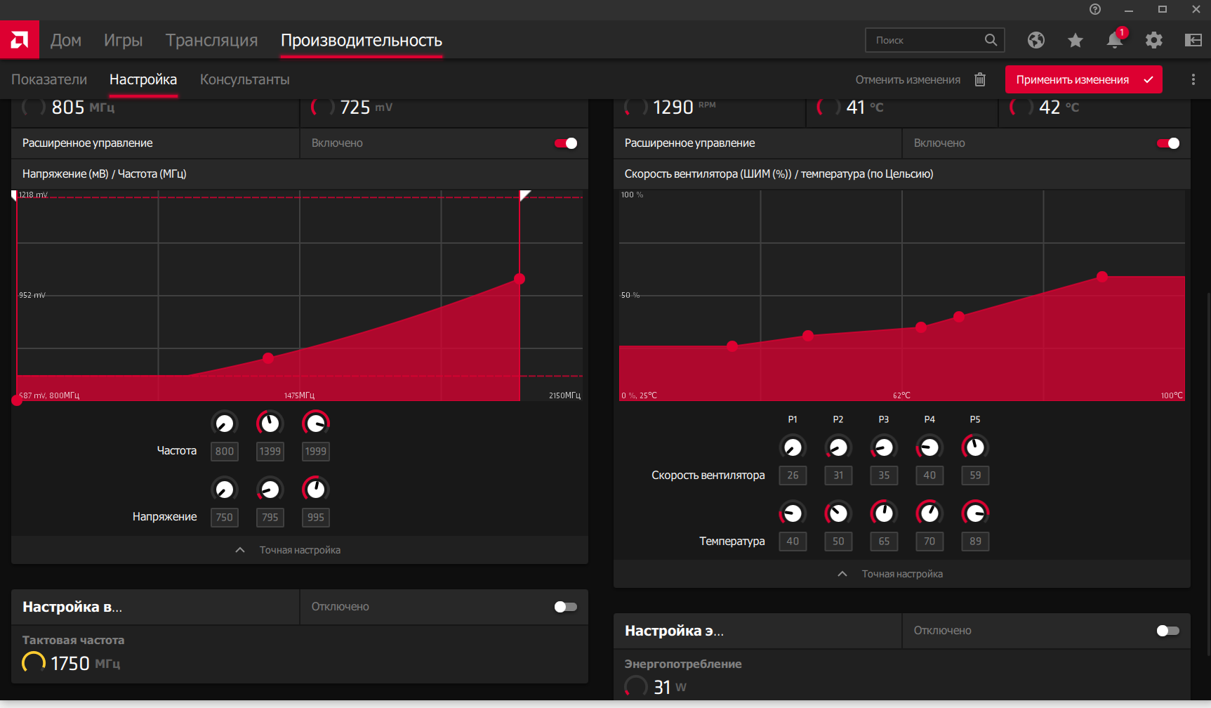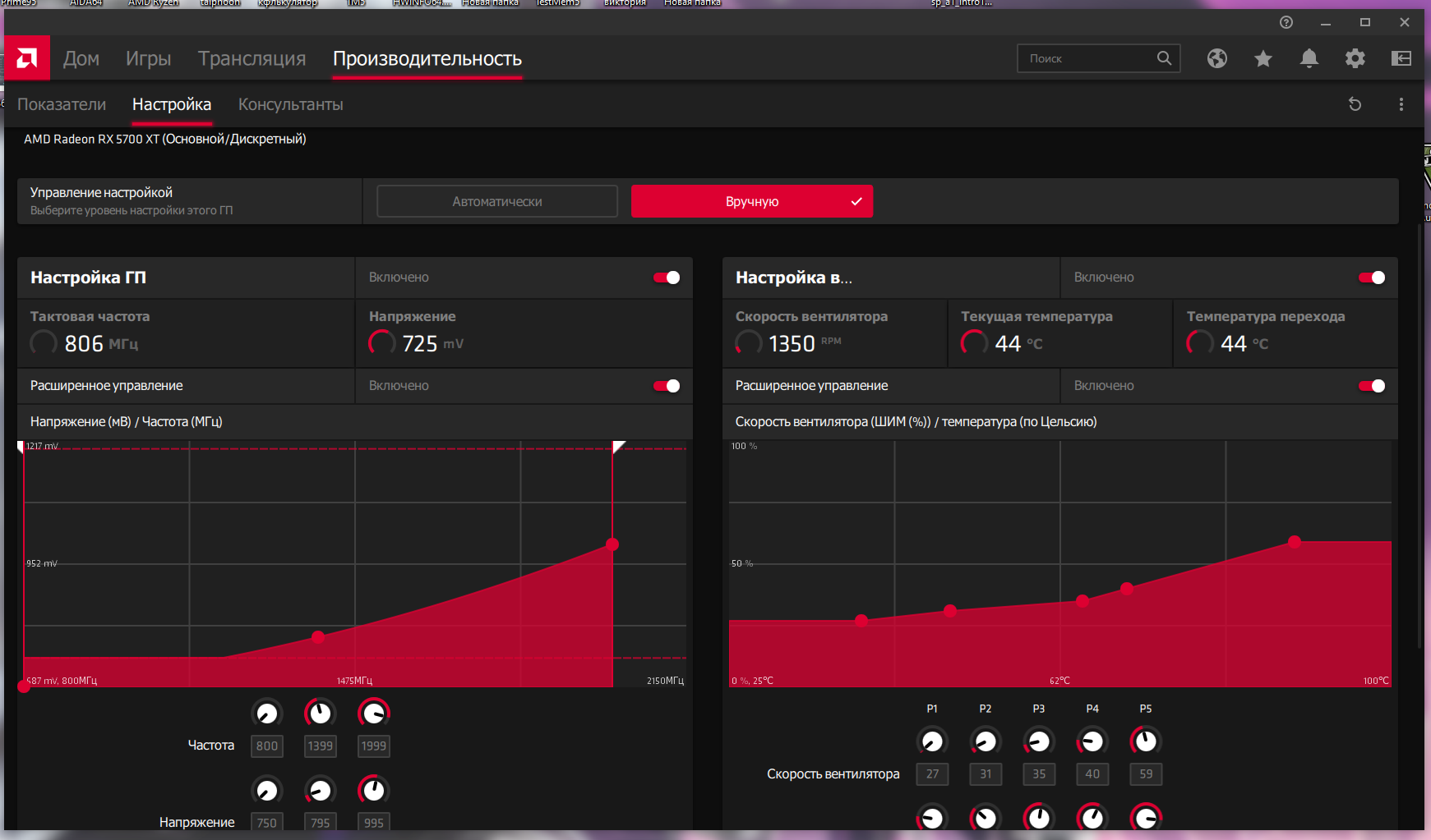 я сделал несколько иначе, сделал два профиля (средние и низкие значения вольтажа и частот не трогал) 1. частота 1960 - 1.0 - настройки вертушек плоская шкала без нарастающей 27% -это 1160-1190 оборотов 2. частота 2060- 1.060 - вертушки 33% это 1340-1390 оборотов Хотел снизить по максимуму шум от вентилей при умеренных температурах карты (чип не выше 74 гр. хот спот не выше 90) Для нетребовательных игр использую первый профиль, вентили практически бесшумные а для всего остального второй профиль, соответственно в играх в первом случае чип стабильно бустит практически никогда не опускаясь ниже 1900гц, во втором случае 2000гц. Все сугубо индивидуально конечно, у меня корпус NZXT H700 спереди стоят три вертушки 120мм на 1100 оборотов выхлоп сзади одна 140мм тоже на 1100 и сверху одна 140 на 800-900 оборотов (все вертушки noctua)
