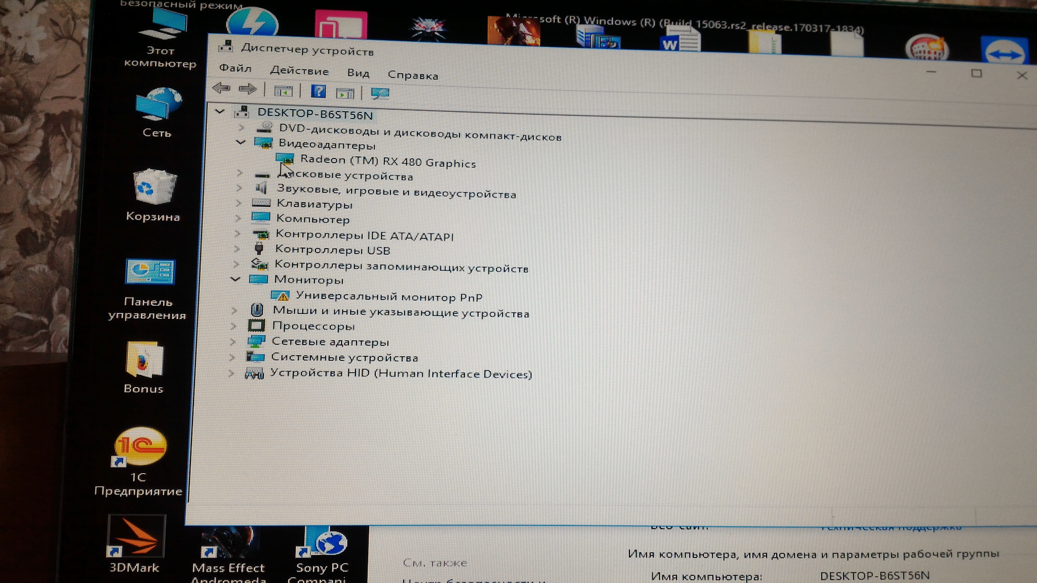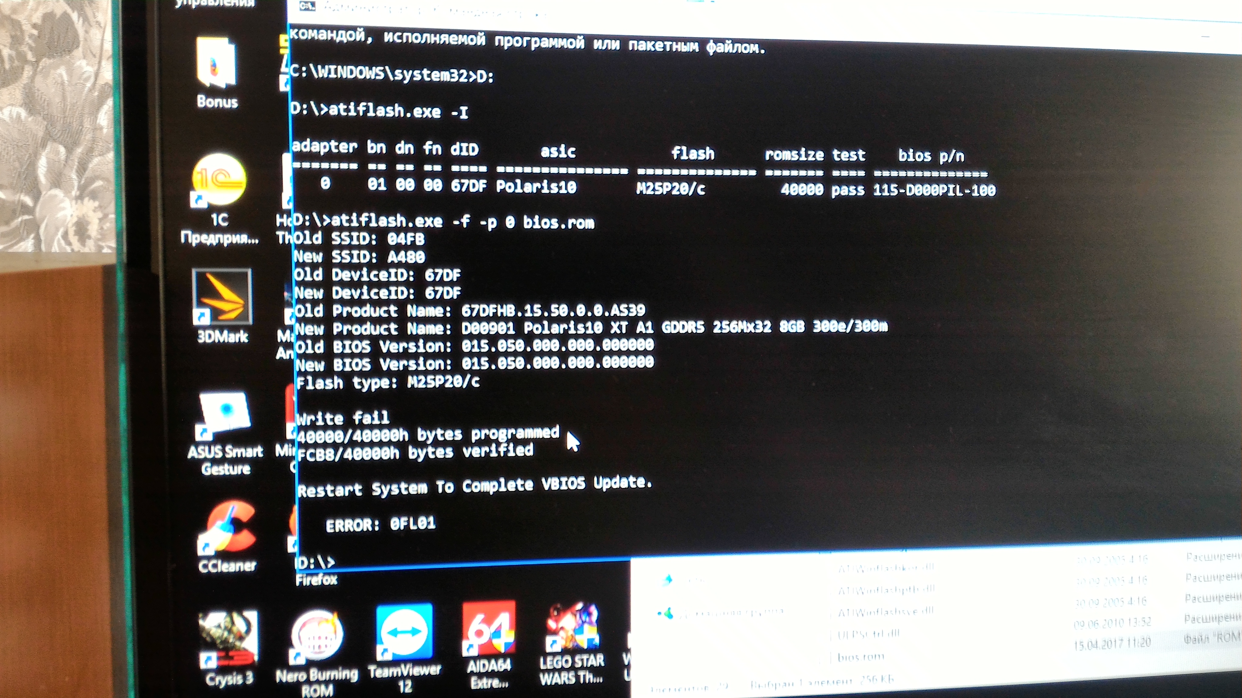 Добрый день! Подскажите в чем может быть проблема и как ее решить? HIS RX480 8gb. Прошил на родной БИОС через AtiFlash из под командной строки с админ. правами, с трудом так сказать, сначала выдавала ошибку, да и сейчас тоже иногда выдает (фото ошибки прилагаю). Дальше загрузил винду без драйверов и стал накатывать последние дрова. Во время установки когда устанавливается сам драйвер и монитор начинает мигать - изображение выдает рябь, а потом просто темный экран. Перезагрузив с помощью кнопки reset, винда выдает ошибку.(фото прилагаю), а в безопасном режиме могу загрузиться и удалить драйвера и опять нормально войти в винду. Эксперты , подскажите какие мои дальнейшие действия ? Понижать напругу, уменьшать чистоты памяти, что может вызывать данный глюк при установке драйвера? Без драйверов карта работает исправно в любом разрешении, можно смотреть фильмы, серфить в инете. Заранее всем огромное спасибо!