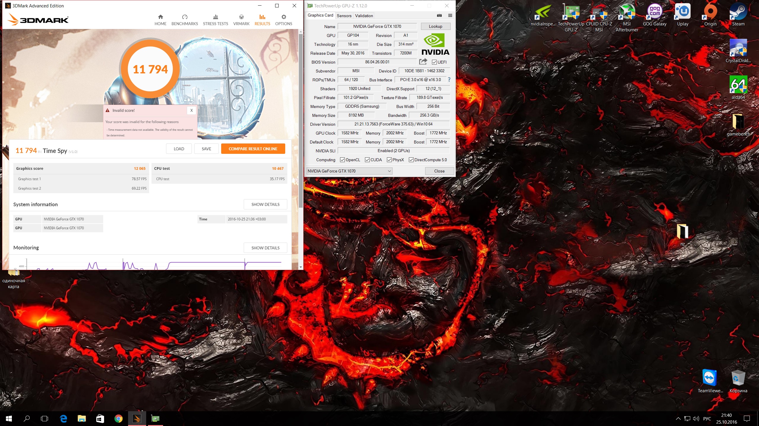 Ничего не понимаю.... Тестил родную прогу от ХОФа, потом заметил что в тестах карта перестала нагреваться и результаты немного упали... Частоты при этом мониторятся те же... Переустановил драйвер, снес родную прогу, воткнул опять свой профиль в афтербернере и та же фигня: карта не греется, результат на 600 очей в TimeSPY ниже..