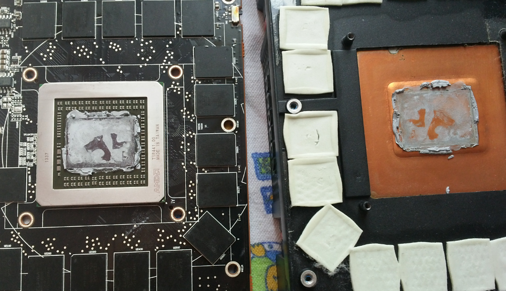 Имею в распоряжении MSI 290 реф. с ноября 2013 года, заплатив за неё 14700 р. Картой очень доволен, никаких проблем не испытывал, её производительности хватает с запасом, в ближайшее время продавать не собираюсь. Прошло 1,5 года и «зачесались руки» что-нибудь поковырять. Перепрошил БИОС от 290х – чуда не свершилось. Затем решил наградить «ветерана 3D баталий MSI 290 реф» приобретя для него СВО, так как хоть иногда и поигрываю в наушниках, шум от реф. СО заметен на фоне остальных компонентов системы. Приобрёл в оверхарде EK-SBAY DDC 3.2 PWM, EK-CoolStream PE-240 dual, EK-FK-R9-290X nickel и прочие фитинги, шланги. Получил истинное удовольствие от приобретения и от процесса сборки. Все компоненты отлично сделаны и упакованы, особенно фуллкавер, просто шедевр, металл и стекло – настоящий хай-тек! Вот теперь появилось желание поделиться впечатлениями от различных комбинаций видеокарт в моей системе, которые стояли в последние годы. Корпус GIGABYTE 3D Aurora 2008 года, алюминиевый с верхним расположением БП и тремя 120 мм вент., один на вдув – два на выдув, проц. AMD X6 1090T @3.8 c кулером Thermaltake Contac 29 с вент. 120 мм, БП Corsair -HX 850W с 140 мм вент. и прочее. 1) Видео – две MSI 6850 cyclone oc в кроссе. GPU - 900Мгц, память – номинал а) темп. верхней ВК 78 С, нижней 74 С. б) темп. на радиаторе системы питания СРU мат. платы – 58 С. в) темп. воздуха, выдуваемого корпусными вент. – горячий г) воздух на выходе из блока питания – очень горячий. Обороты вент. БП очень высокие. д) обороты вент. на кулере CPU – выше средних. Вывод – в корпусе «мини-крематорий». На общем фоне, больше всего шумит блок питания и видео карты. 2) Видео – MSI R9-290 реф. GPU – 1000Мгц, память – 5000Мгц а) темп. видео карты 90С (установлена в ССС ограничение, турбина 53%). ВРМ1 – 68С б) темп. на радиаторе системы питания СРU мат. платы – 50 С. в) темп. воздуха, выдуваемого корпусными вент. – тёплый г) воздух на выходе из блока питания – тёплый. Обороты вент. БП - средние. д) обороты вент. на кулере CPU – средние. Вывод – достаточно холодная система с горячей и шумноватой вк. Часть горячего воздуха из вк. попадает внутрь корпуса через подлое отверстие в верхнем торце карты. 3) Видео – MSI R9-290 реф. СВО от ЕК. GPU - 1111 Мгц, память – 5500 Мгц.(почему такой разгон? -просто цифры красивые) а) темп. видео карты 58 С , ВРМ1 – 54С б) темп. на радиаторе системы питания СРU мат. платы – 47 С. в) темп. воздуха, выдуваемого корпусными вент. – прохладный. г) воздух на выходе из блока питания – прохладный. Обороты вент. БП – минимальные. д) обороты вент. на кулере CPU – ниже средних. Вывод – холодная и бесшумная система. СВО это великое благо, будет возможность – никогда не буду покупать вк., которая оставляет горячий воздух внутри корпуса! Радиатор охлаждения расположил снаружи, на задней стенки корпуса, а вентиляторы внутри( горячее – снаружи, шумное – внутри, получилось и тихо и прохладно) Ещё хочу обратить внимание на контактное пятно реф. системы охл.,которое открылось моему взору после демонтажа – есть о чём задуматься, фото прилагается.