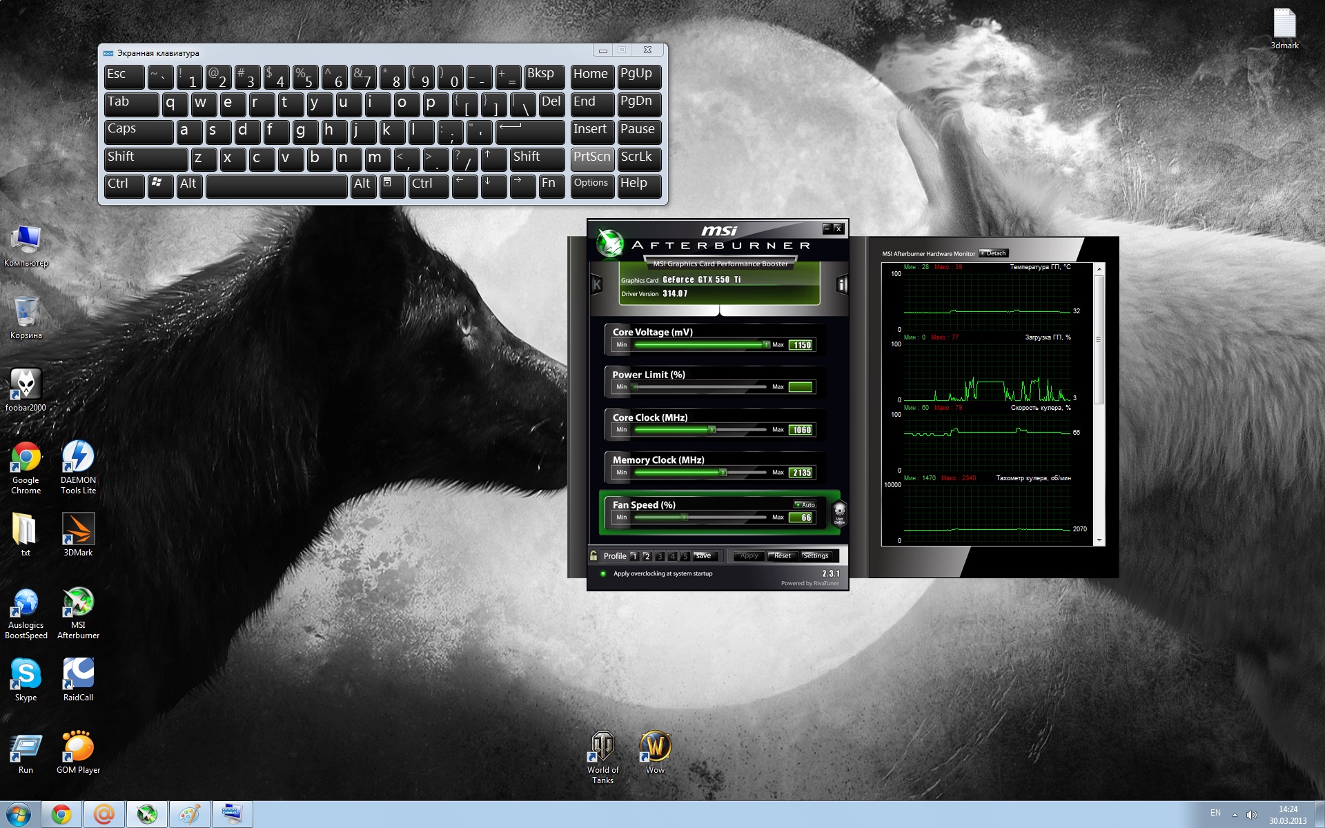 кстати...кто может подсказать,я тоже озадачился охлаждением карты,начал гнать её,все нормально,но что то стремно,какой предел допустимый для разгона? я скриншот сделал с показателями,глньте кто в этом хорошо шарит,сколько еще можно добавить? п.с в средней нагрузке (WOW и Танки) температура 56-60,при максимальной (кризис) около 64-66,ну а в простое около 32 где то. кстати еще хотел узнать что значит в msi power limit?