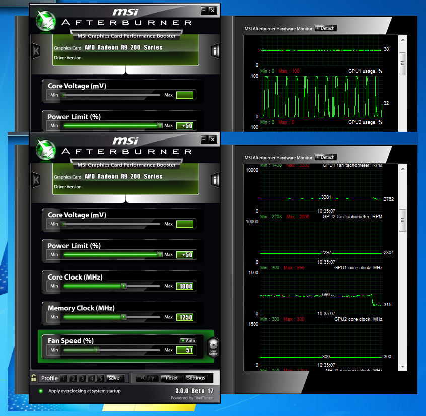 Moonk мне просто интересно, почему вторая карта нормально гонится до 1000 по чипу и 1500 по памяти имея 68% по асику, а первая карта имеет асик 78% и при 1000 и 1500 падает в черный экран при снятии нагрузки, чисто технический интерес. Кстати, первая карта подключена к телевизору по hdmi