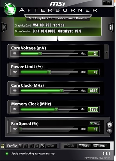На 290(Х)? НЕ-ВЕ-РЮ. В MSI AB на 290-й больше чем на 100 не поднять, поэтому в этой проге я уперся в 1140 по чипу. Для 1150 надо уже 125мВ подать и MSI AB этого уже не может.