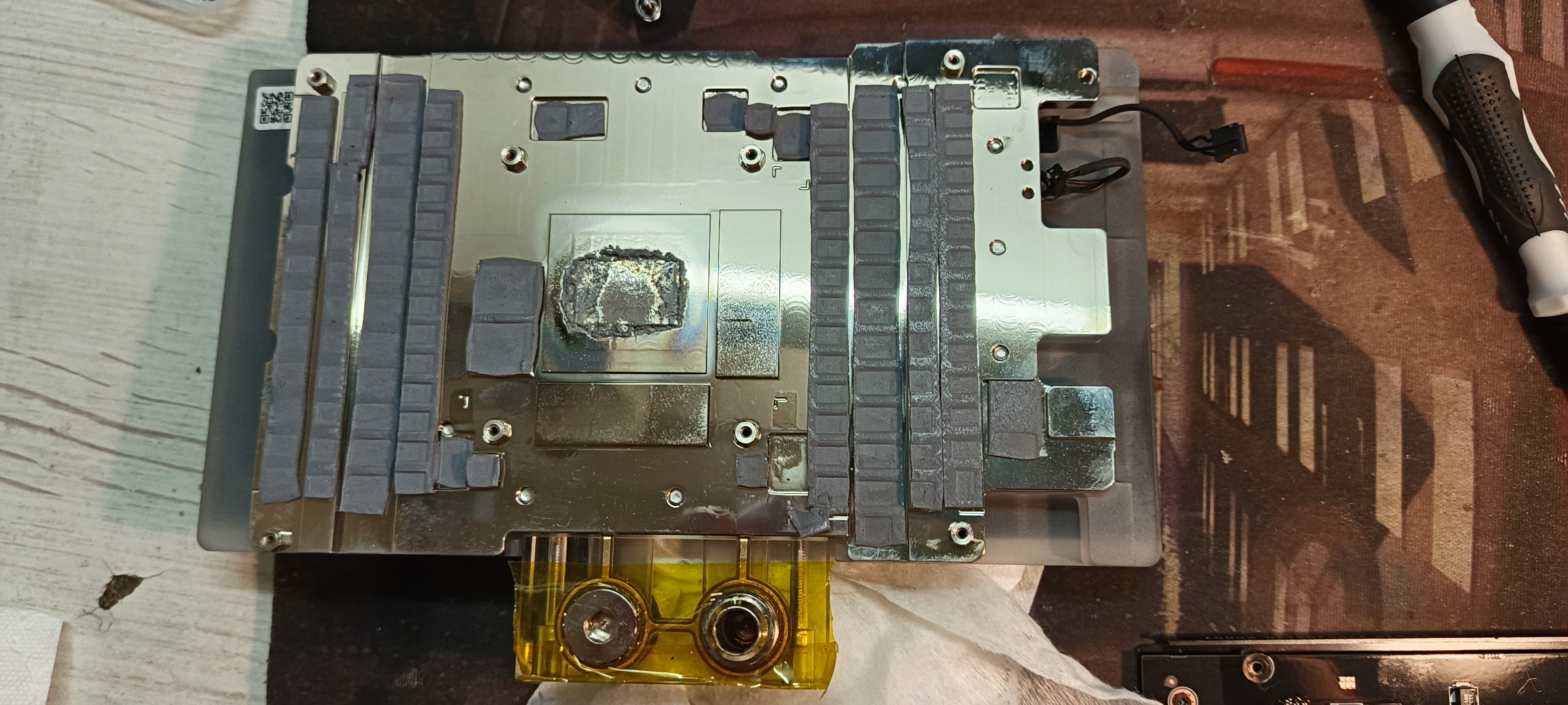 Так на втором и 3-м фото виден как раз медный радиатор, и видны вход и выход воды, вход снизу, выход сверху они рядом штуцера, прокладки идут все нужные, на все мосфеты, катушки, все оставил, они прямо свежак, но какие порвались заменил, на чип поставил фазовый переход, так же если посмотрите на плату, спереди где выходы HDMI сверху на последнем фото есть разъем под вентиляторы, и справа внизу около железной пластины есть 3 разъема, 2-х пиновый, это датчик утечки воды, над ним трех пиновый подсветка и еще один разъем вентилятора, я подключил 3 вентиля для радиатора видеокарты как раз в передний разъем, спаял провод с 4 pin мини коннектором на разветвитель стандартный вентиляторов, аккуратно все провел, теперь головняк управления вентиляторами снят, а до этого измучился, как ими правильно управлять, подключал выход к управлению охлаждения процессора, но это конечно бред. И кстати весь текстолит карты залит приличным слоем лака водоотталкивающего, что тоже порадовало, короче гига серьезно отнеслась к этой карте, это не кастом из простой вентиляторной на какой нибудь EKWB..