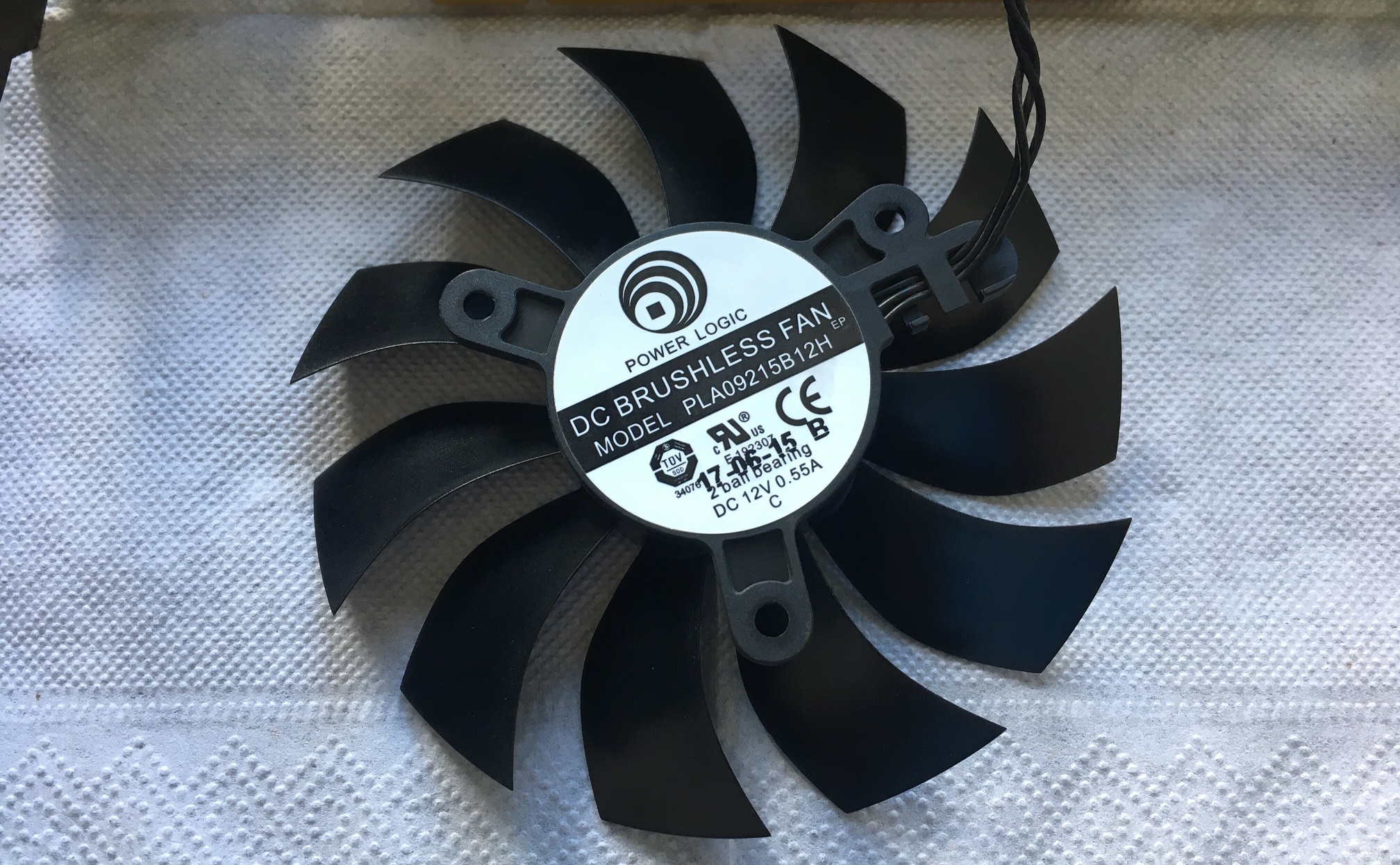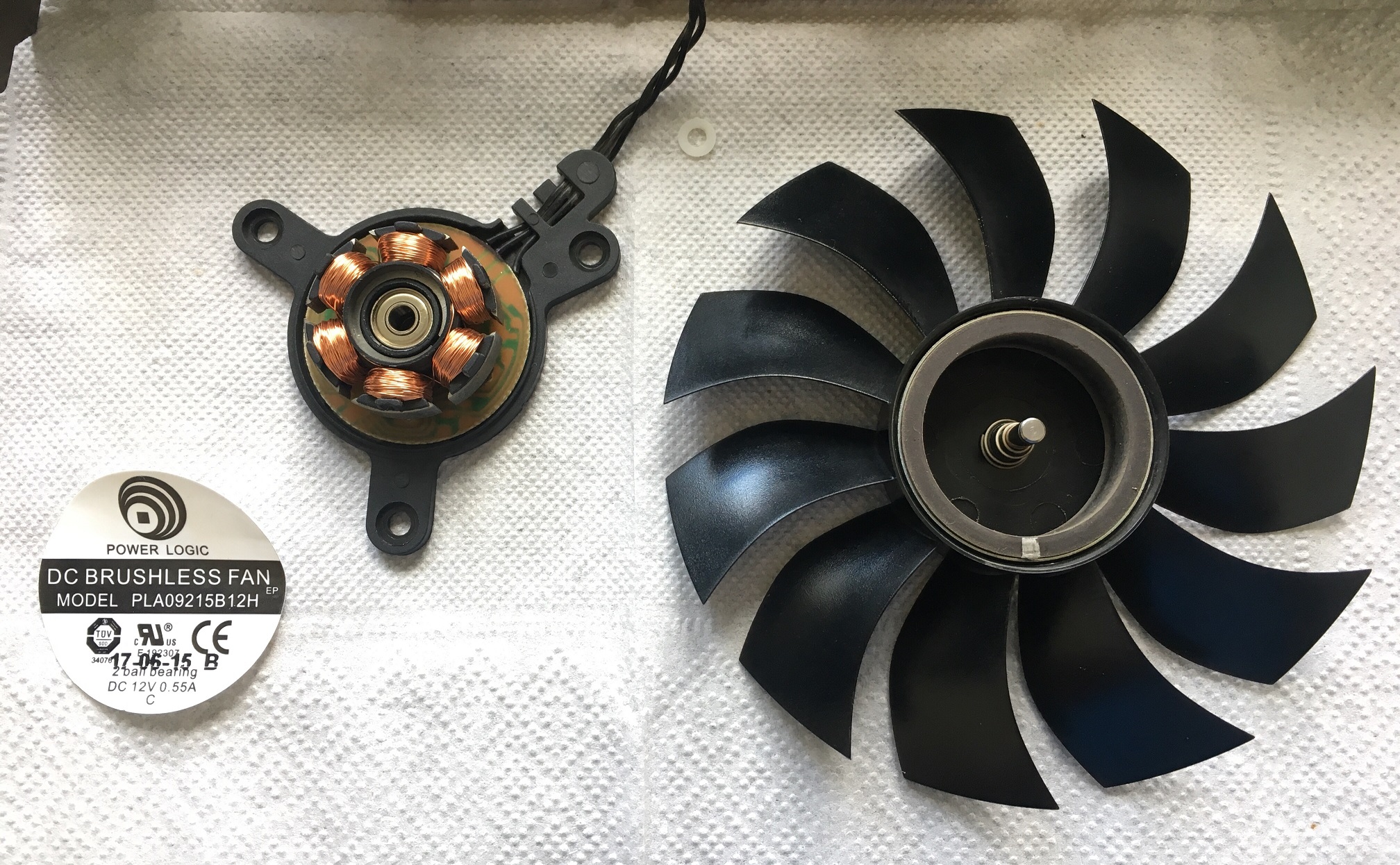 Собственно вентилятор, а если быть совсем точным, то его разборка. Данные вентиляторы от Power Logic стоят на видеокартах EVGA. На SC2 Gaming и SC Black Edition Gaming точно, на счёт FTW3 не знаю, так как лично не видел маркировку. Модель вентилятора - PLA09215B12H (2 Ball Bearing, DC 12V, 0.55A).