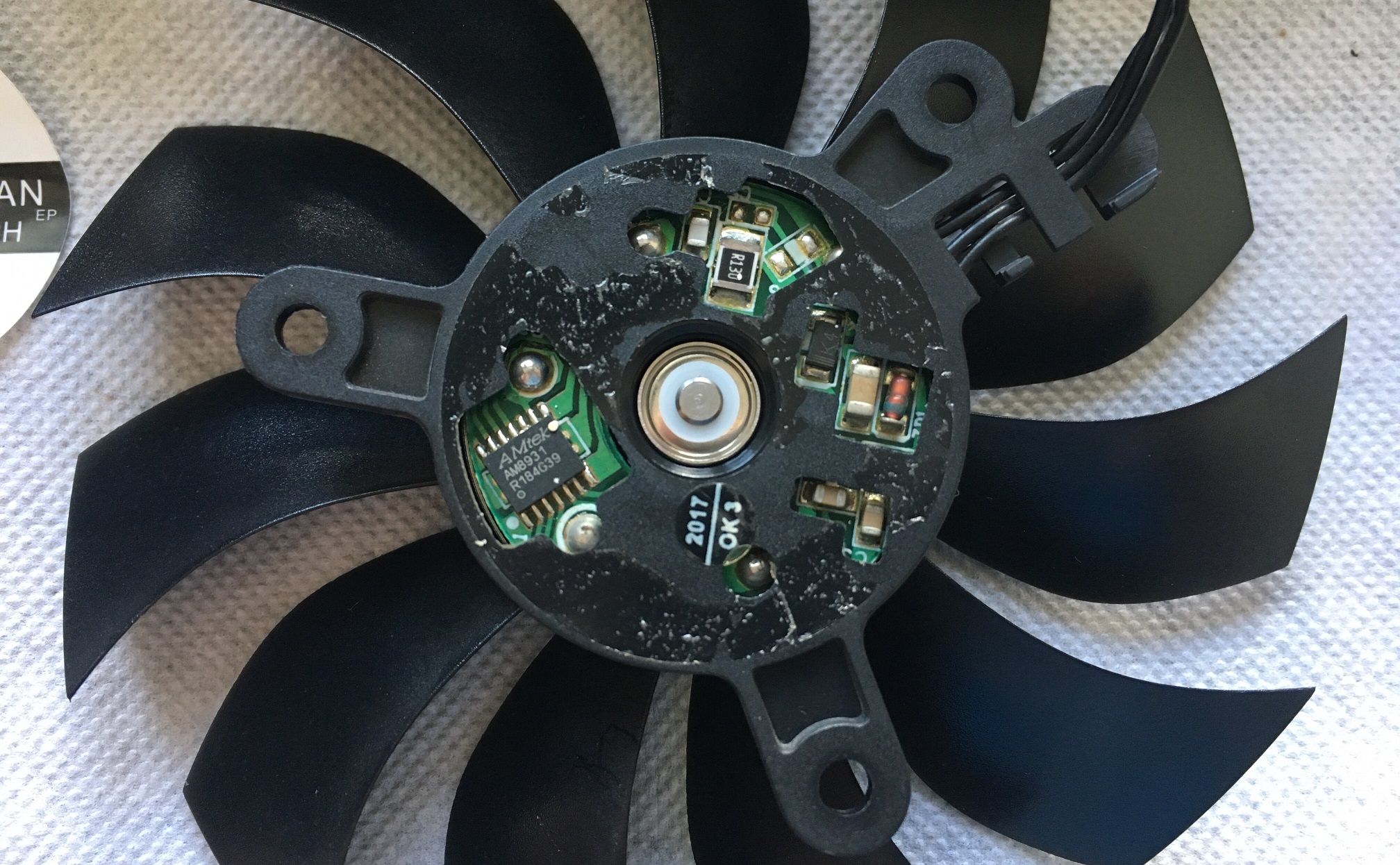 Разбирается вентилятор на удивление просто и быстро. Для этого необходимо отклеить наклейку на обратной стороне вентилятора (где номер модели), под наклейкой сразу же можно будет увидеть плату, электрические компоненты, один из подшипников и белое пластиковое (или из чего оно делается?) стопроное кольцо на оси вентилятора.