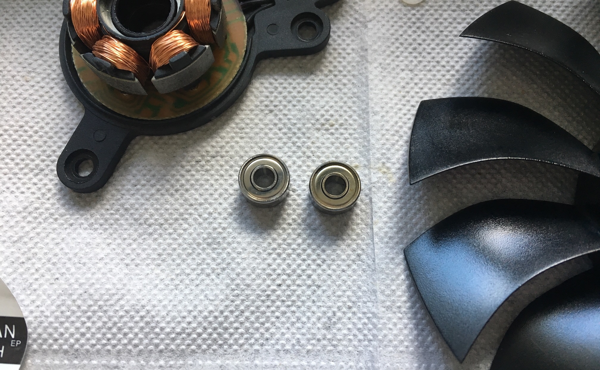 Вентилятор разобран! Можно удалить пыль\грязь и смазать. Отдельно стоит отметить, что подшипники могут казаться визуально одинаковыми, но они на самом деле разные (верхний толще). Не надо пытаться их с силой вбить на место.