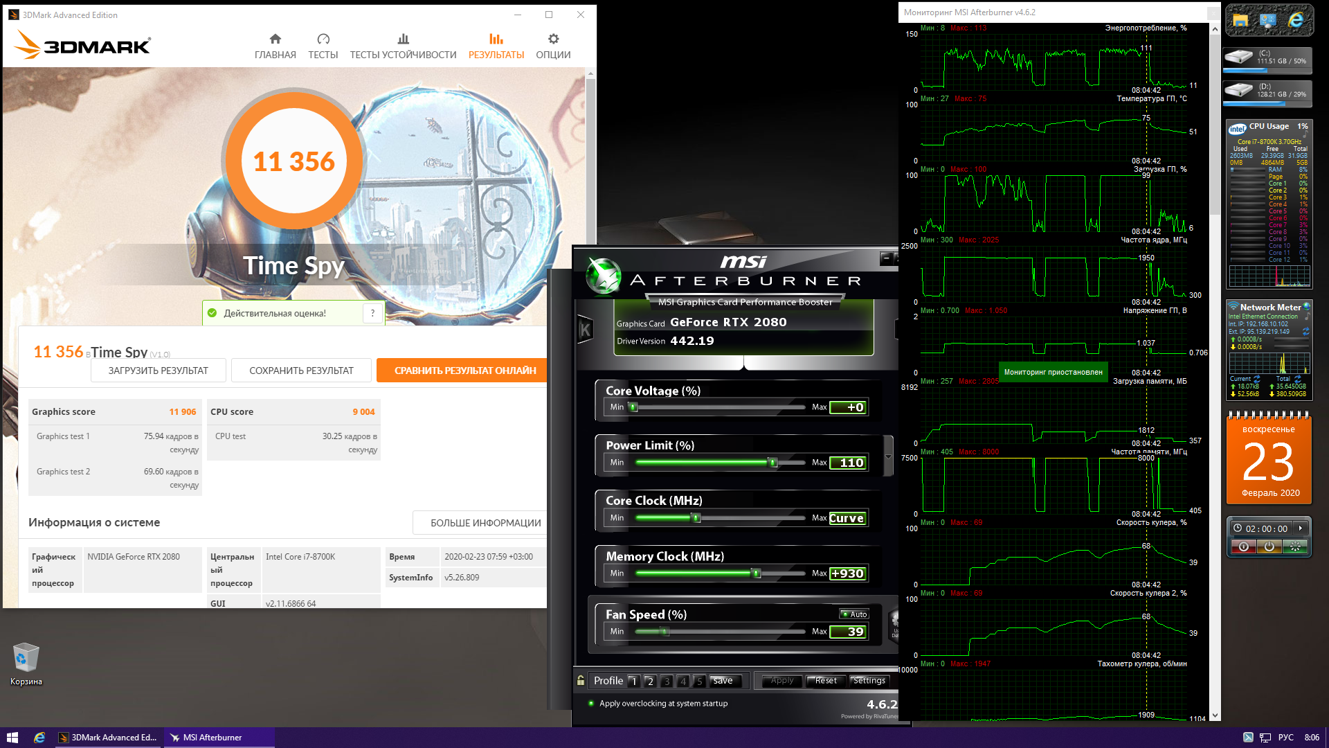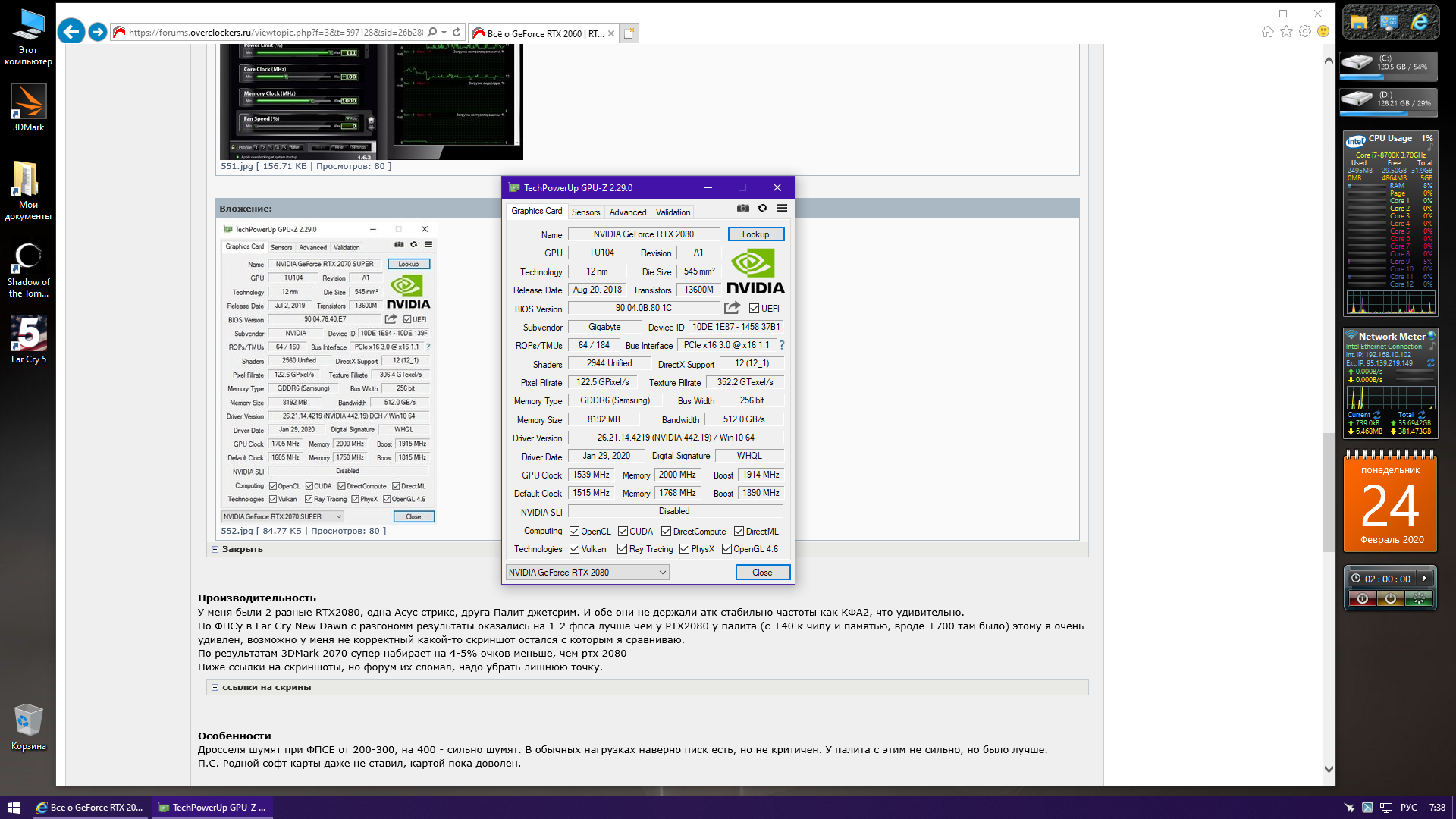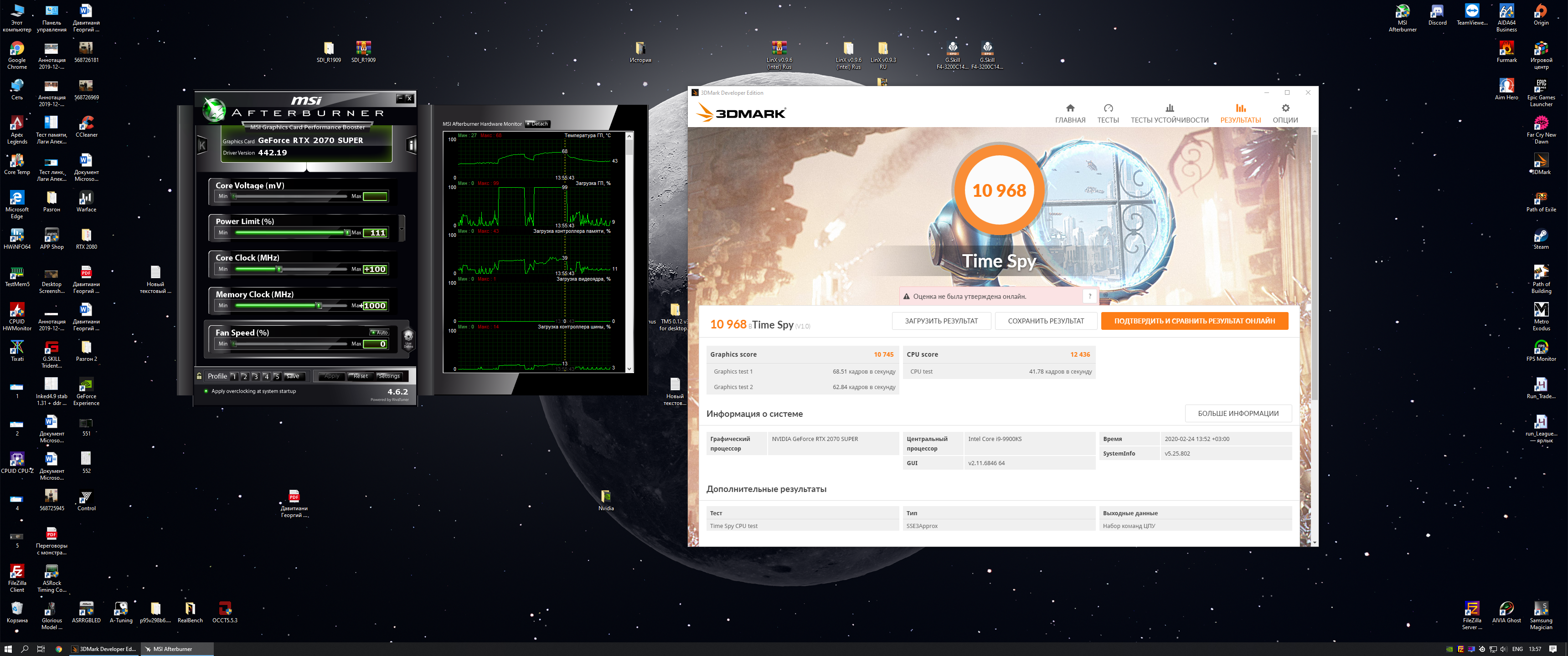 Ну вот, разница 10.8% по графике на одних и тех же частотах между 2070 супер и 2080 и это нифига не погрешность. И это реальные цифры без всяких ковыряний в драйвере и прочих открытых окон и вертушек на 100% для снятия скрина.