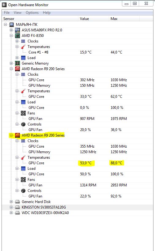 Всем доброго времени суток! Есть у меня R290x от "Сапфира", решил к нему добавить ещё один R290x. Почитав отзывы и тесты, выбрал R290x от MSI, вроде как прекрасное охлаждение и тд. Но установив и открыв ПО MSI Afterburner, заметил что температура видеокарты была уже 50 град, и это без нагрузки, а "Сапфир" показывал всего 30 град. Циркуляция воздуха в корпусе хорошо организована: кулера на передней, задней, верхней и боковой пенели, хорошие чистые "Залманские". Поиграв полчаса в Total War Rome II (всё на максимуме, фпс от 40 до 50), глянул темпер: MSI пик температуры 88град при нагрузке кулера 92%, "Сапфир" 62град при 36% нагрузки кулера. Собственно вопрос - это брак? есть ли смысл его отправлять по гарантии? Или может самому есть вариант поправить температуру, например термопасту поменять?